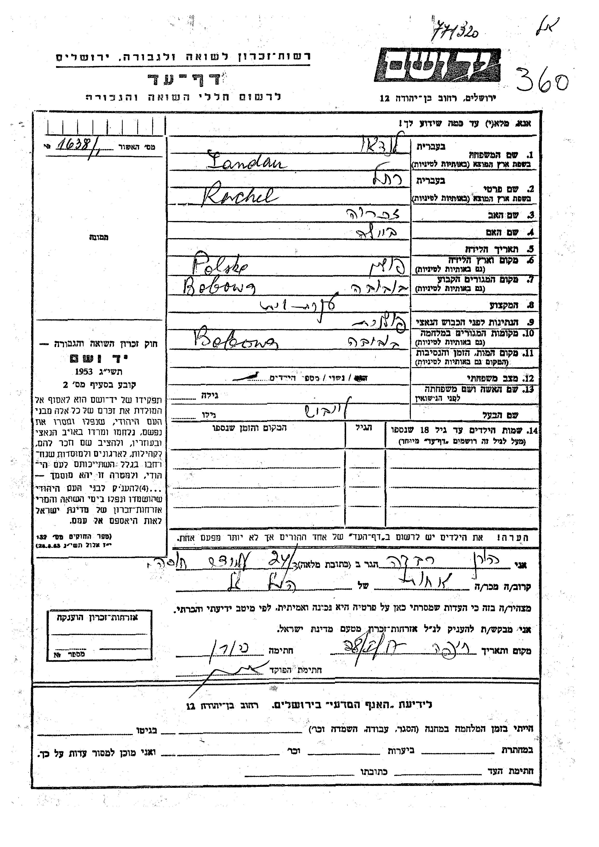 Рахель Ландау, место рождения: Польша. Отец: Захария, mать:Била. Домохозяйка. Женат / замужем. Место жительства до войны: Бобова, Польша. Место во время войны: Бобова, Польша.