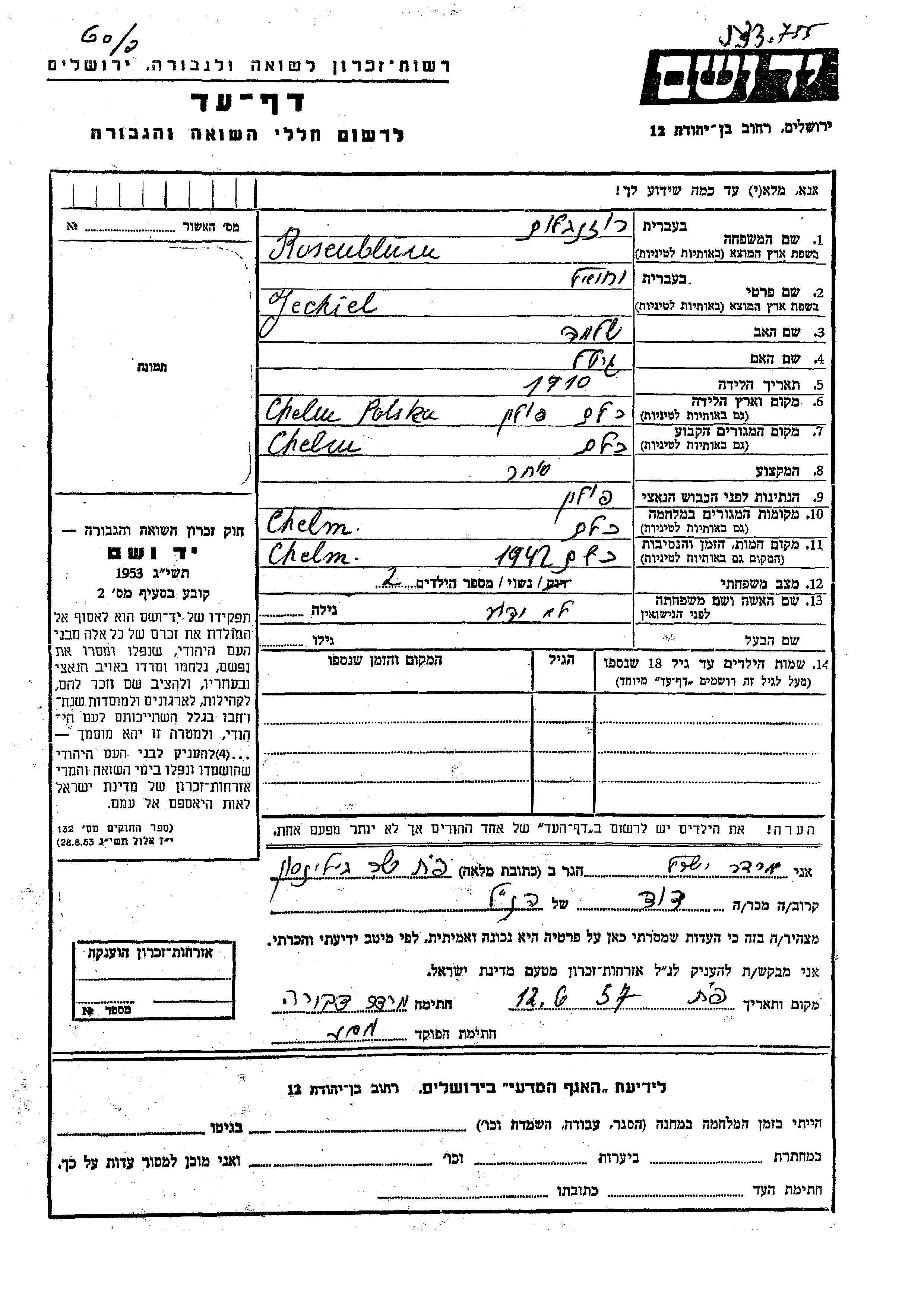 Ехиель Розенблюм, место рождения: Хелм, Польша. Отец: Шломо, mать:Гитель. Торговец / торговка. Женат / замужем. Место жительства до войны: Хелм, Польша. Место во время войны: Хелм, Польша.