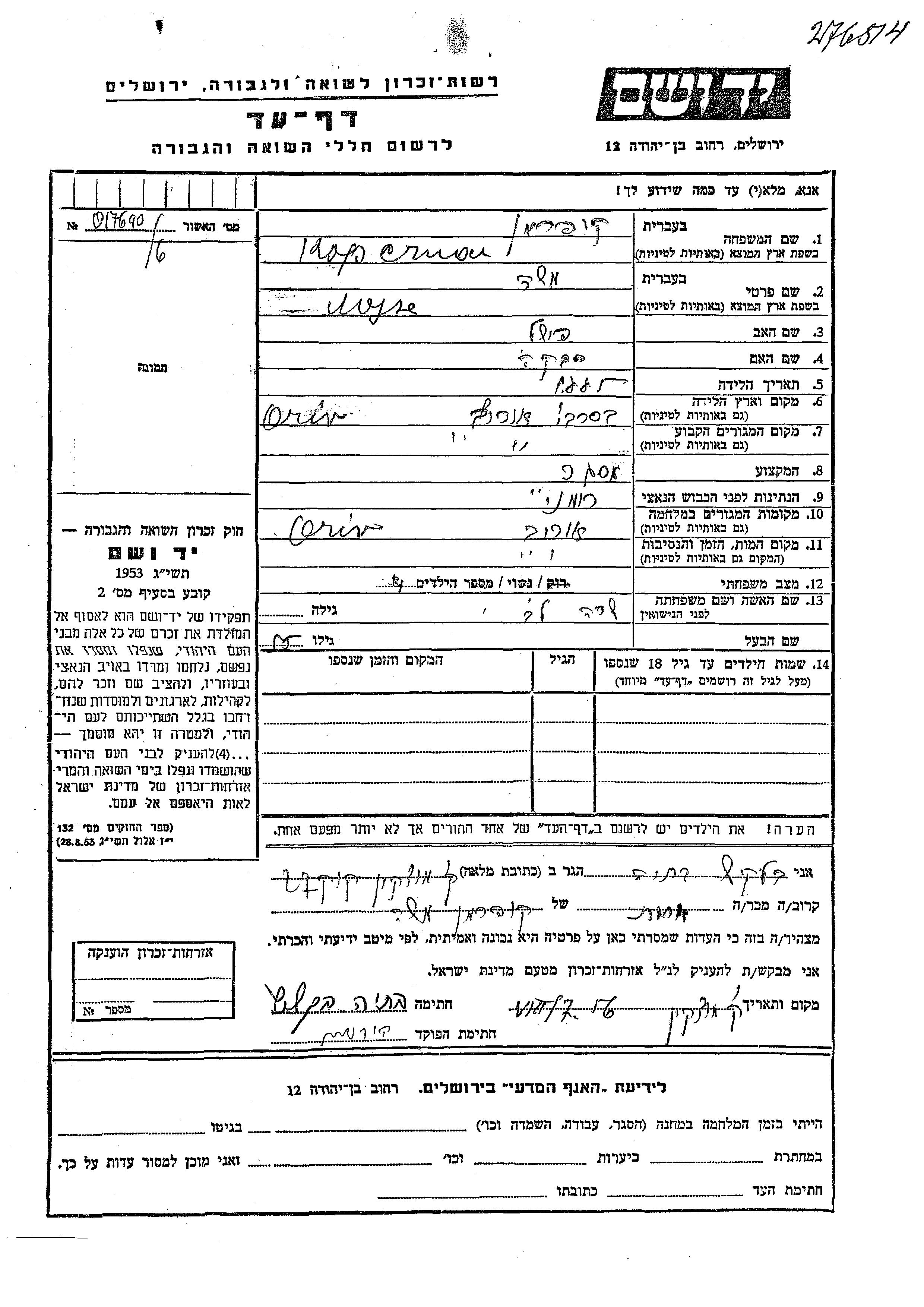 Куперман Моше 1885 Орив, Румыния Лист свидетельских показаний