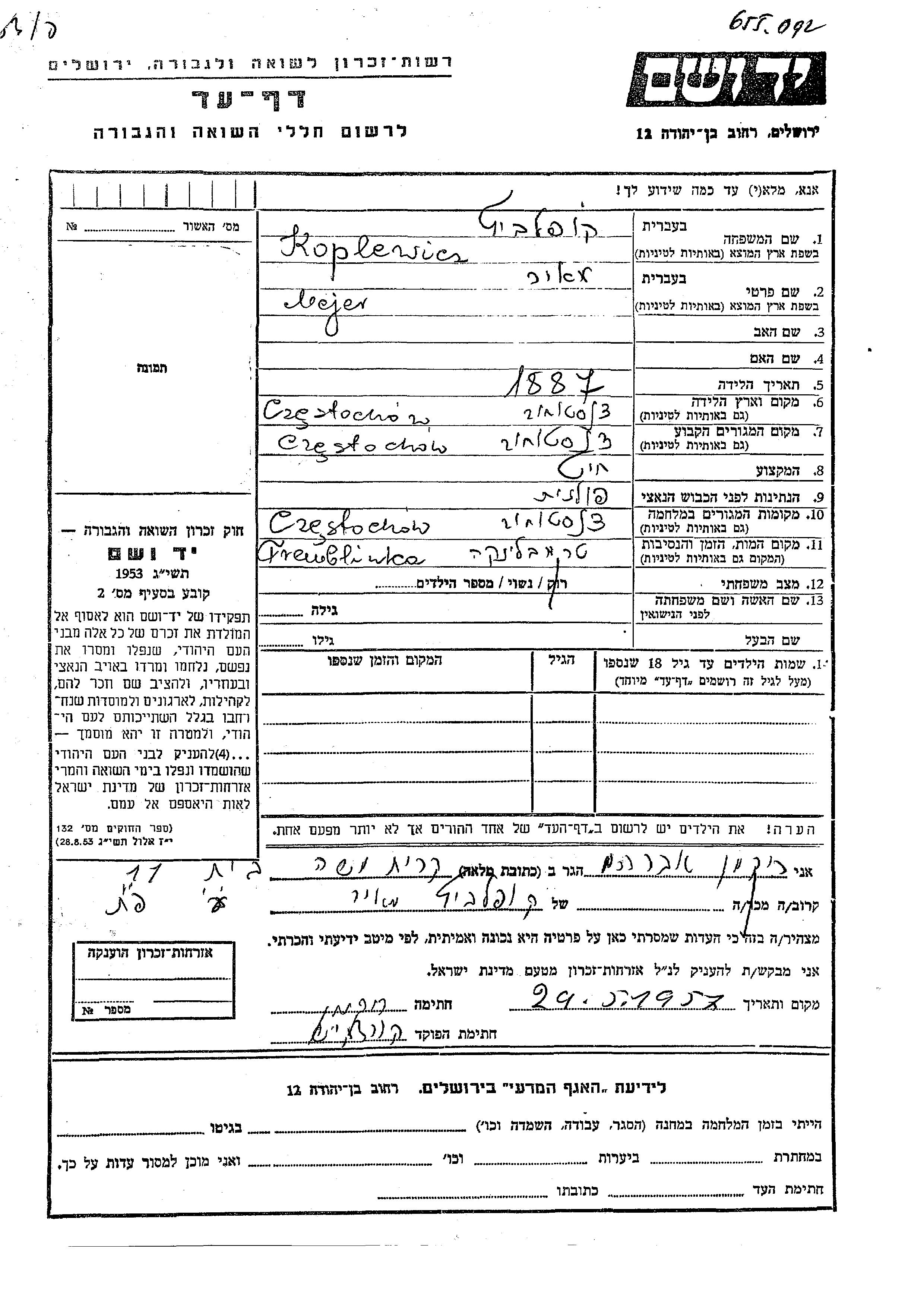 Меер Коплевич, место рождения: Ченстохов, Польша. Портной / портниха. Женат / замужем. Место жительства до войны: Ченстохов, Польша. Место во время войны: Ченстохов, Польша.