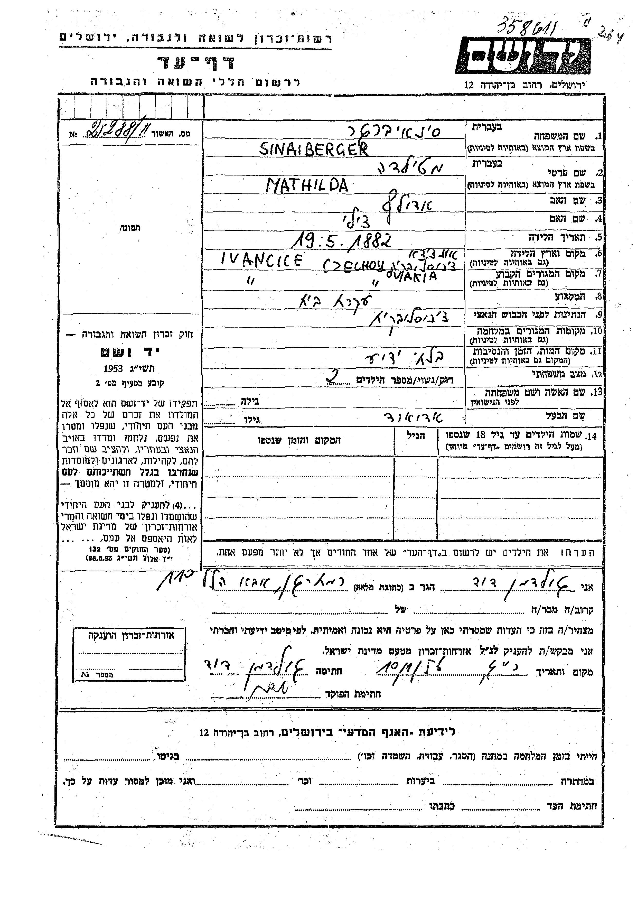 Матильда Синайбергер, место рождения: Иванчице, Чехословакия. Отец: Адольф, mать:Цили. Домохозяйка. Женат / замужем. Место жительства до войны: Иванчице, Чехословакия.