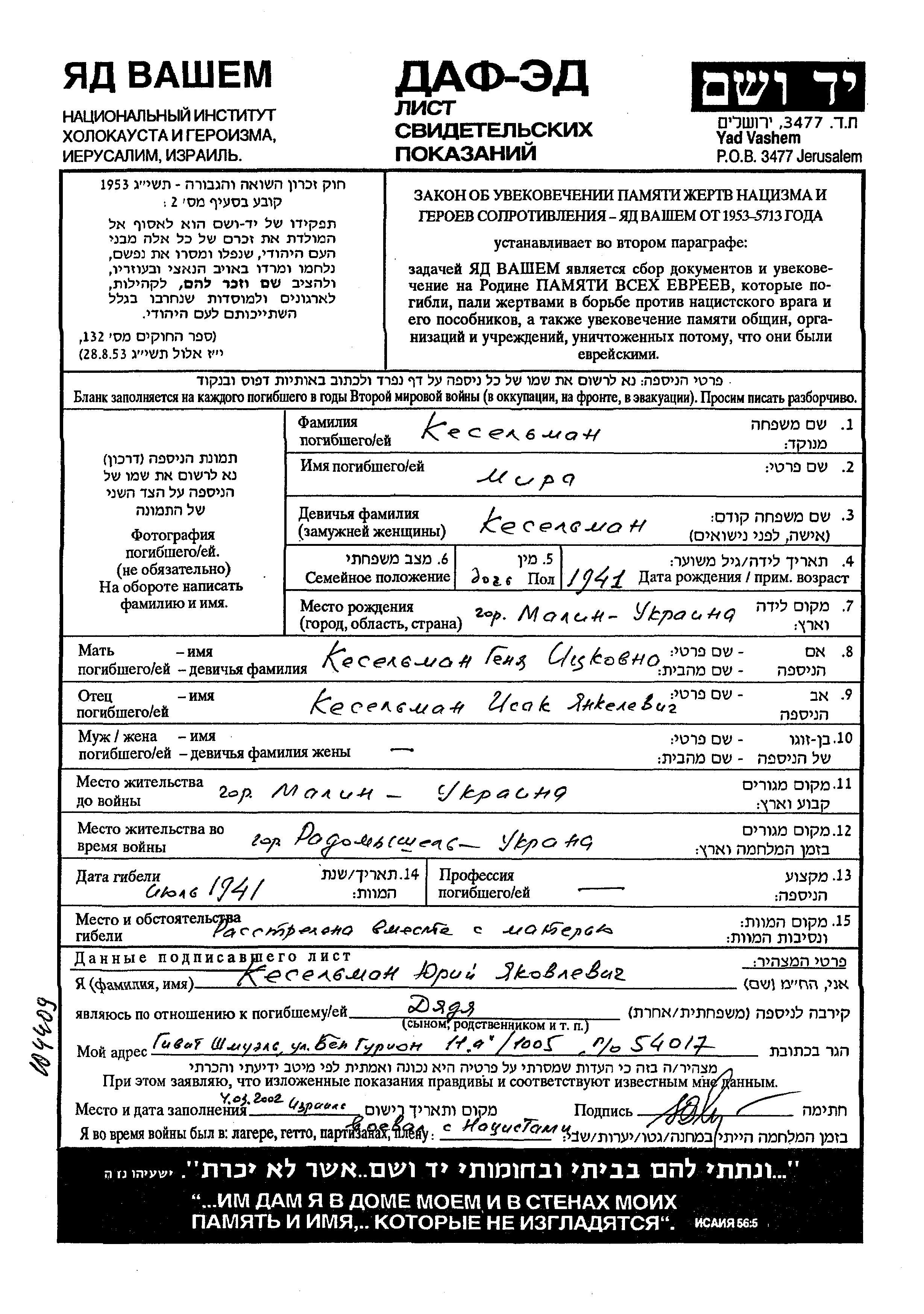 Яд Вашем - Листы свидетельских показаний Мемориального фонда