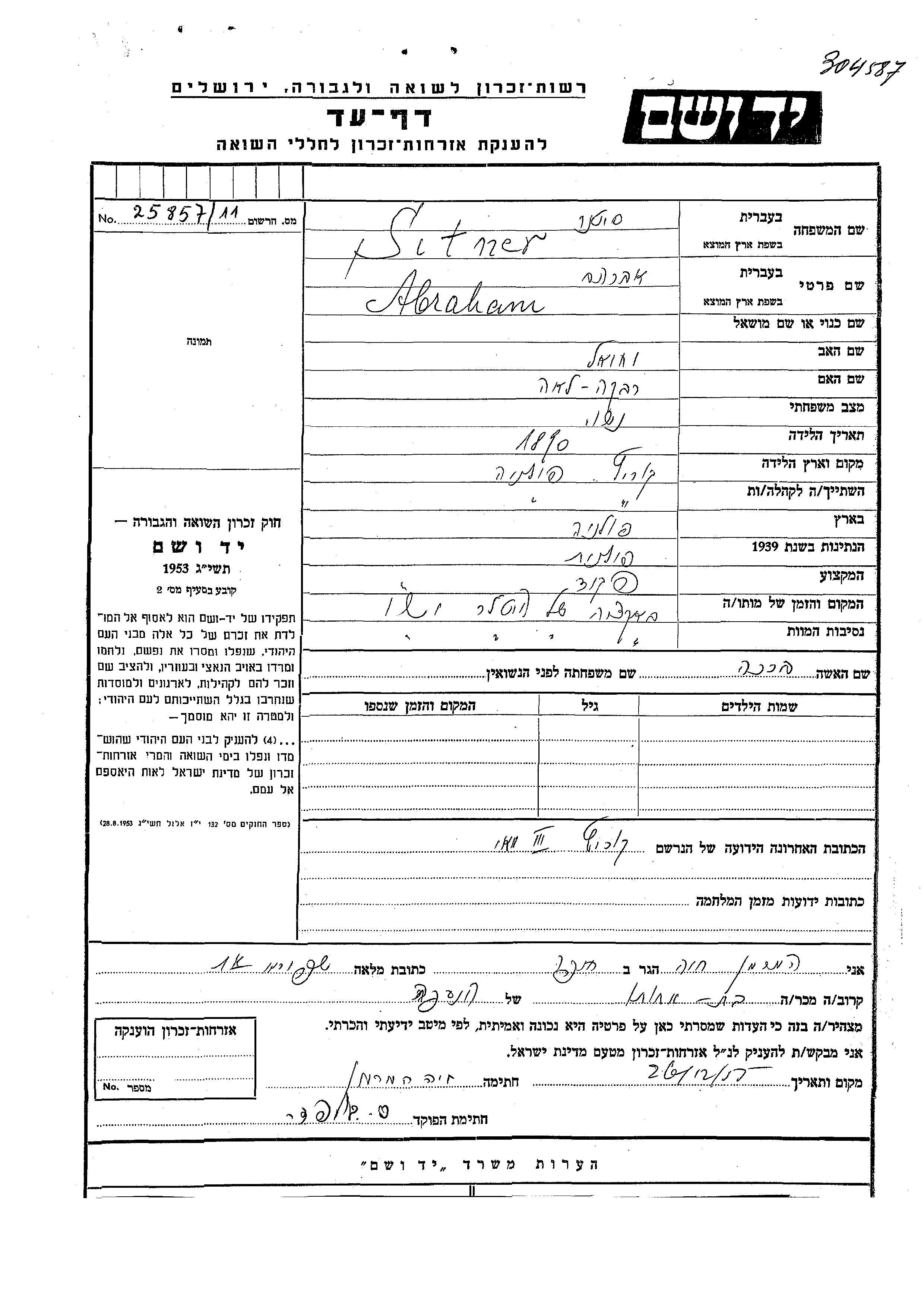 Абраам Ситнер, место рождения: Кожец, Польша. Отец: Иехиэль, mать:Ривка Лея. Клерк. Женат / замужем. Место жительства до войны: Кожец, Польша. Место во время войны: Кожец, Польша.