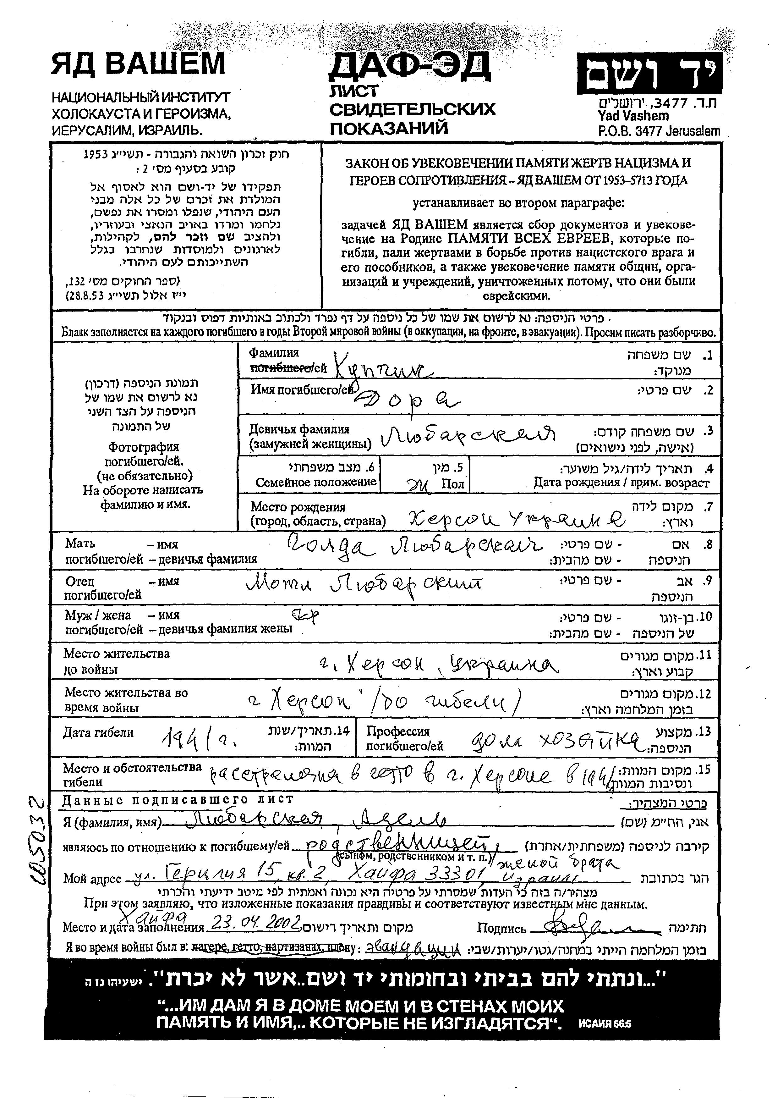 Купчик Дора Херсон, Украина (СССР) Лист свидетельских показаний