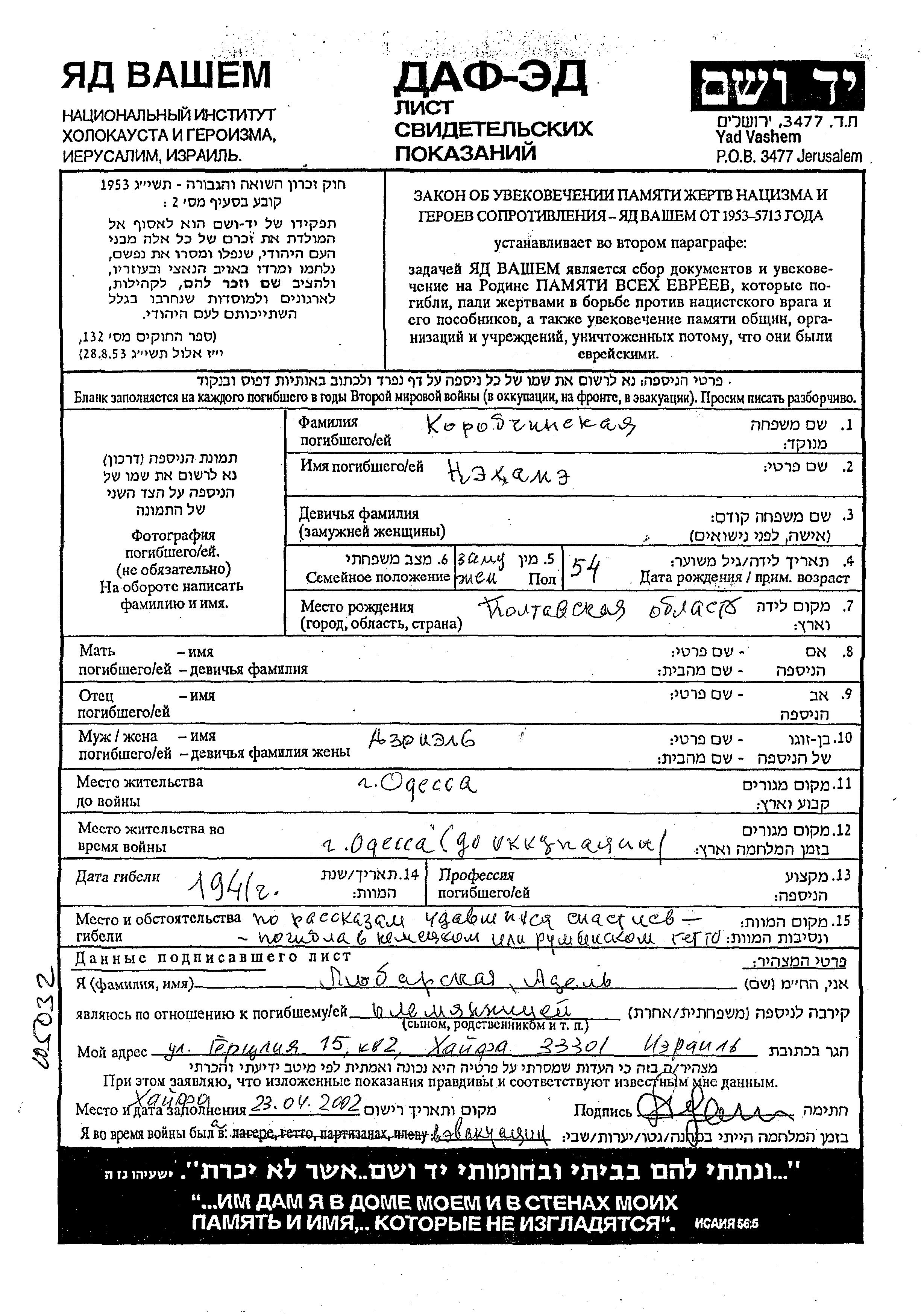 Коробчинская Нехаме Одесса, Украина (СССР) Лист свидетельских показаний