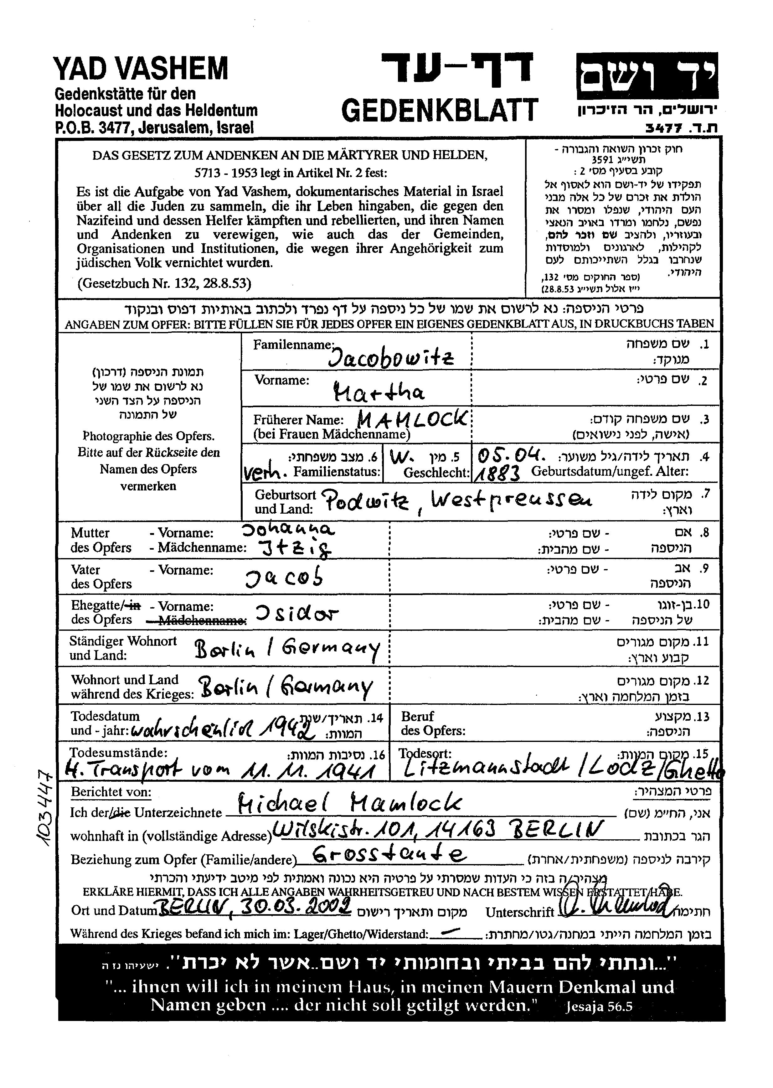 Марта Якобовиц, девичья фамилия Мамлок, место рождения: Пудевиц, Польша. Отец: Якоб, mать:Йоханна. Женат / замужем. Место жительства до войны: Берлин, Германия. Место во время войны: Берлин, Германия.