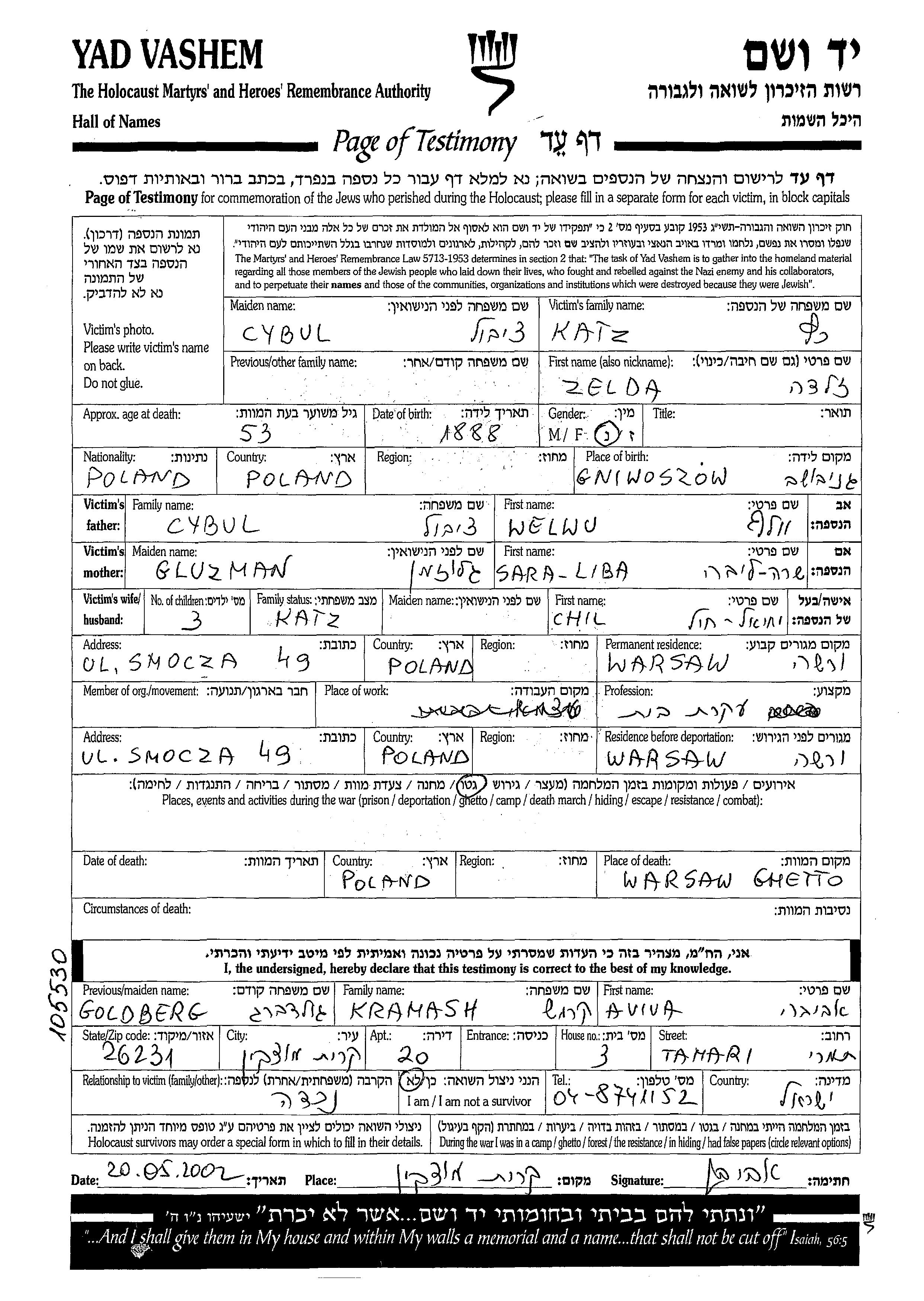Зельда Кац, девичья фамилия Цыбуль, место рождения: Гнивошув, Польша. Отец: Вельву, mать:Сара Либа. Домохозяйка. Женат / замужем. Место жительства до войны: Варшава, Польша. Место во время войны: Варшава, Польша.