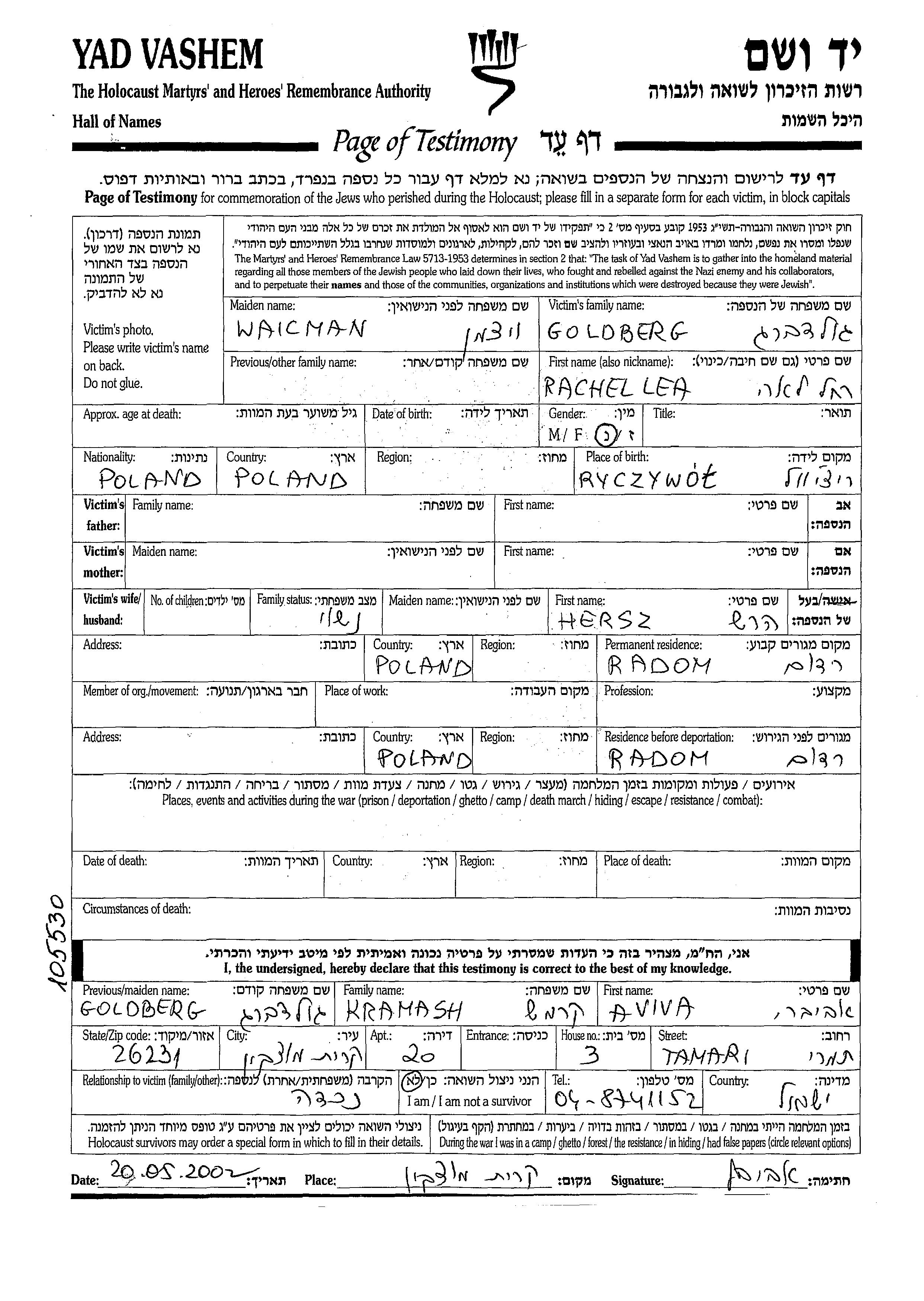 Рахель Лея Гольдберг, девичья фамилия Вайцман, место рождения: Ричиволь, Польша. Женат / замужем. Место жительства до войны: Радом, Польша. Место во время войны: Радом, Польша.