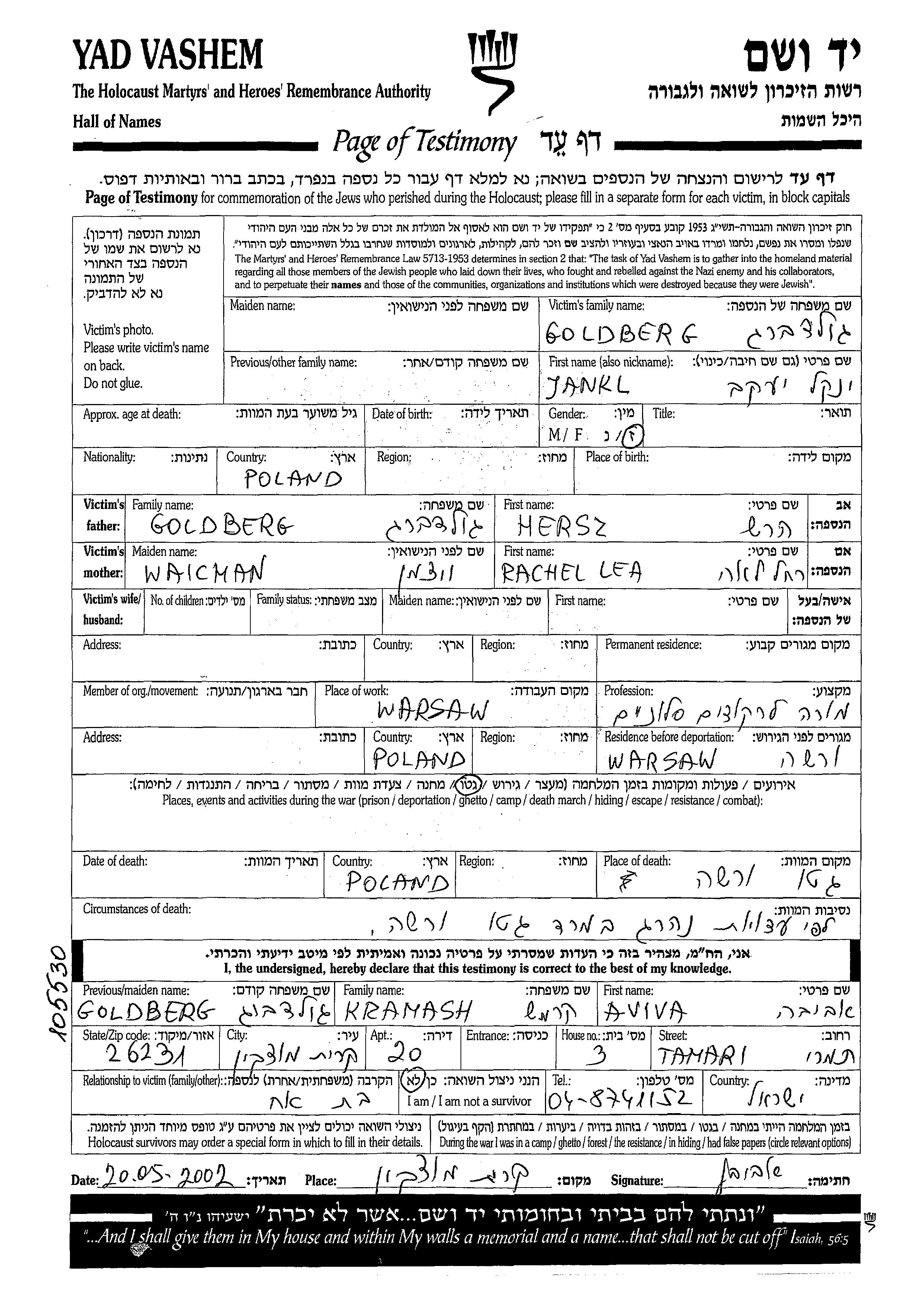 Янкл Гольдберг, место рождения: Польша. Отец: Герш, mать:Рахель Лея. Учитель / учительница танцев. Место во время войны: Варшава, Польша.