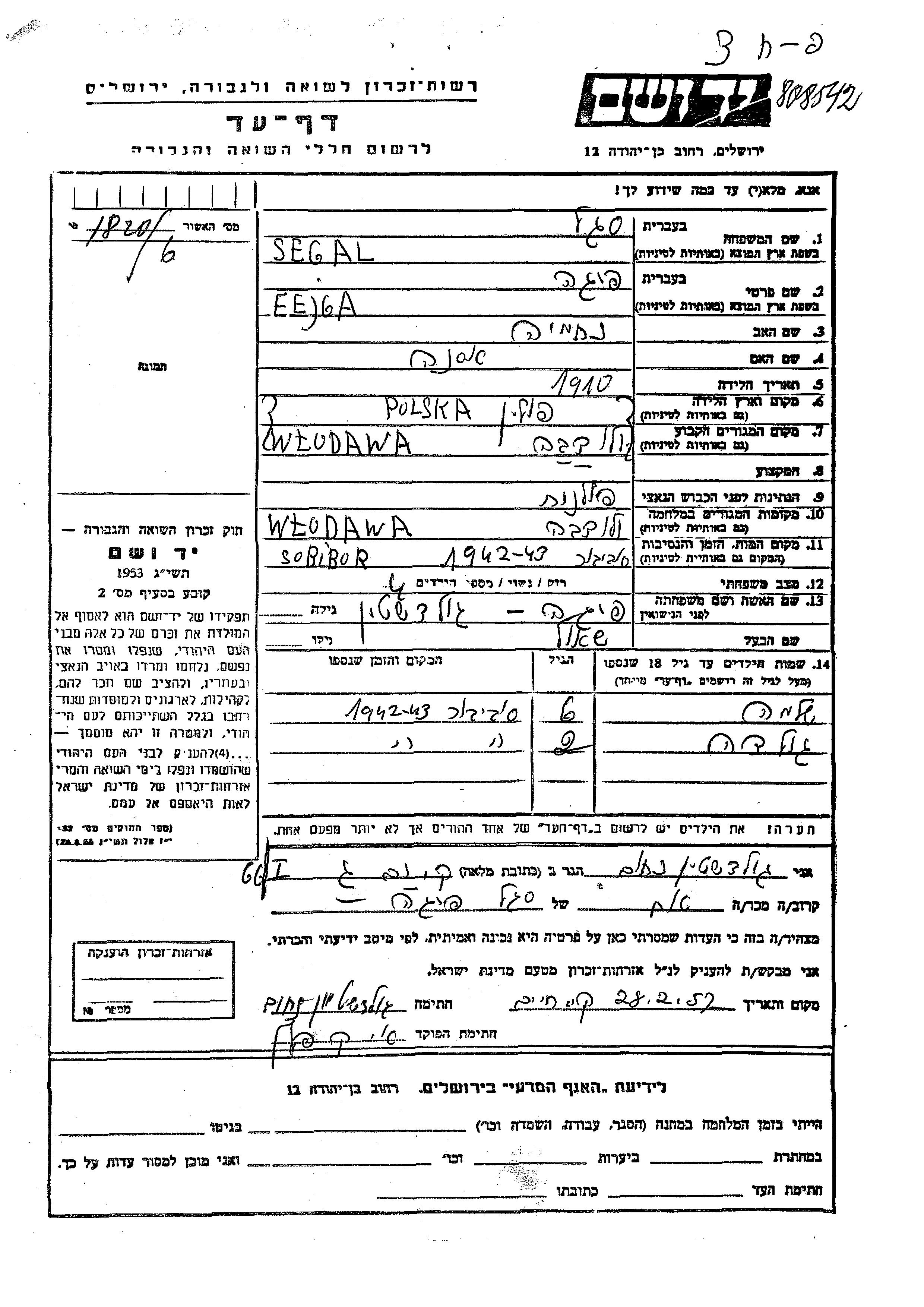 Сегаль Фейга 1910 Влодава, Польша Лист свидетельских показаний
