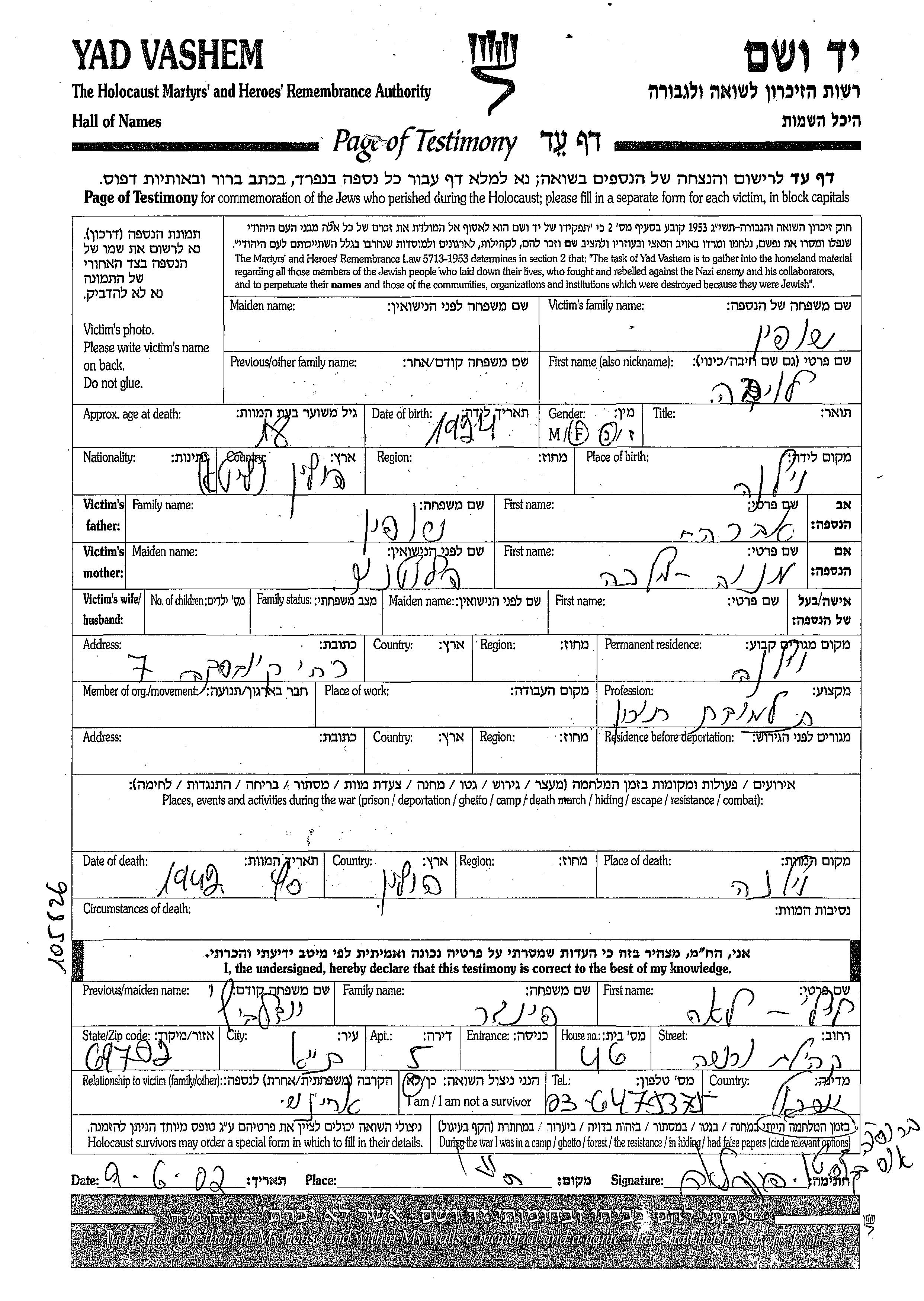 Яд Вашем - Листы свидетельских показаний Мемориального фонда