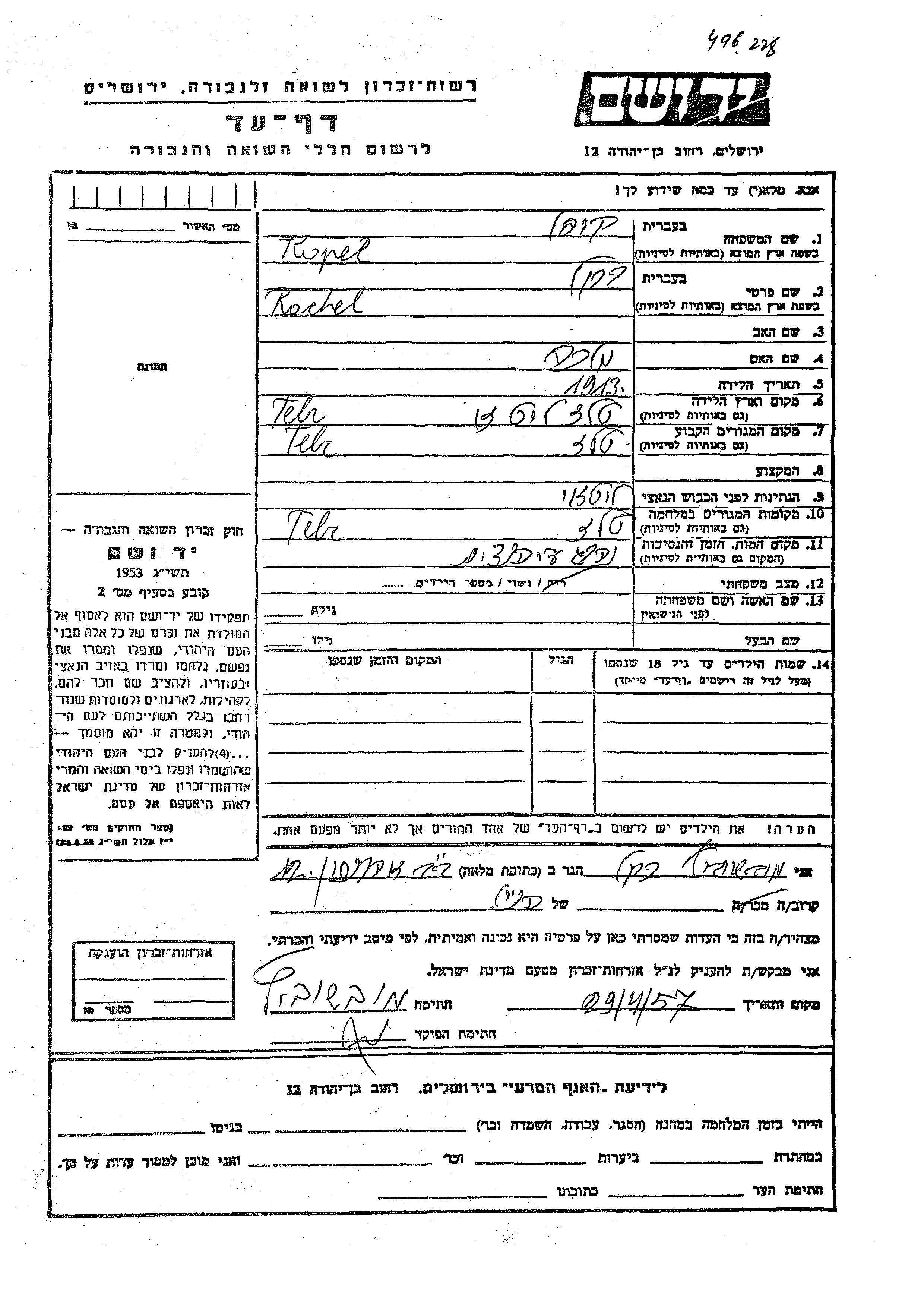 Копель Рахель 1913 Тельз, Литва Лист свидетельских показаний