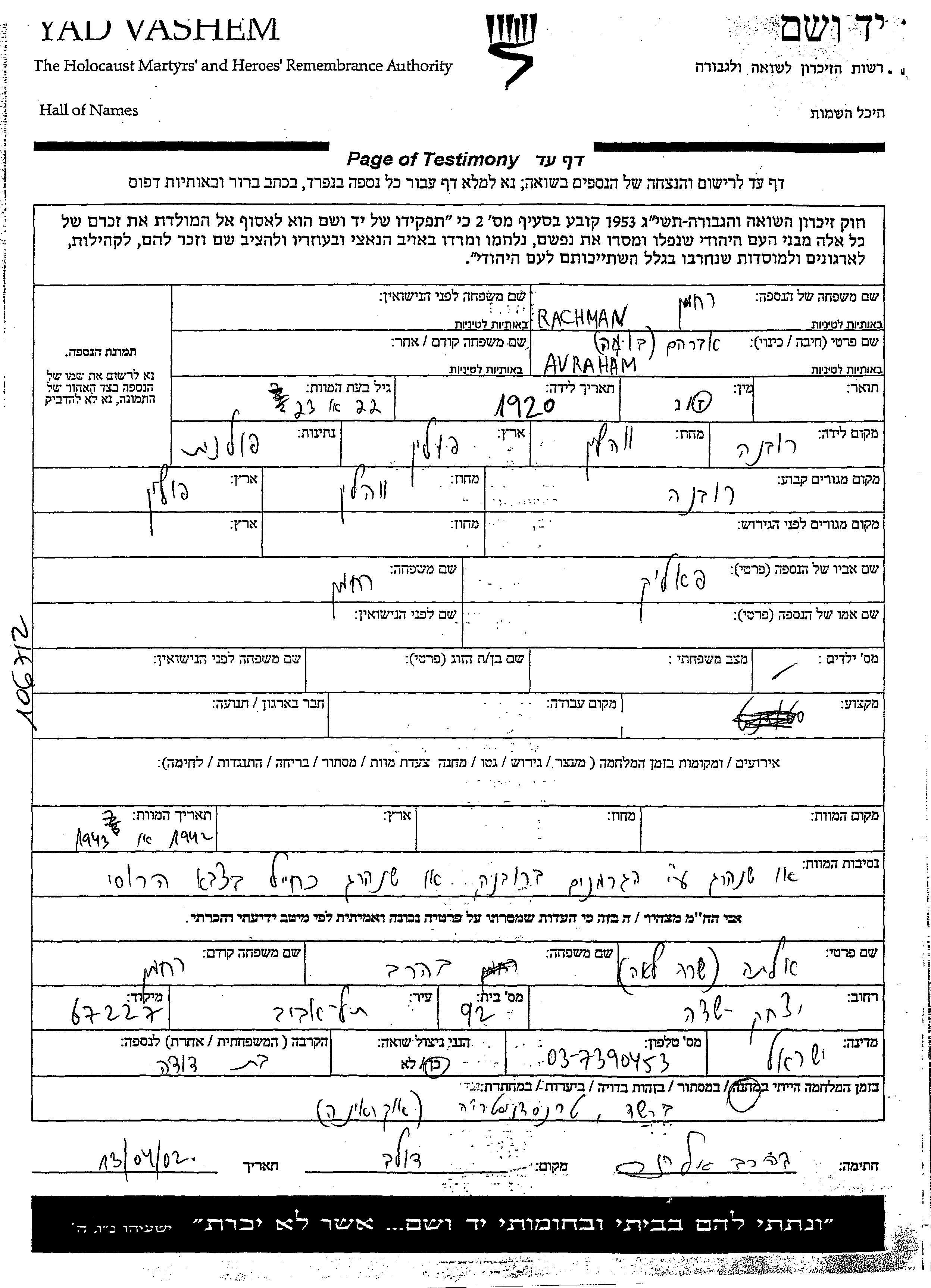 Авраам Рахман, место рождения: Ровно, Польша. Отец: Фалик. Место жительства до войны: Ровно, Польша.