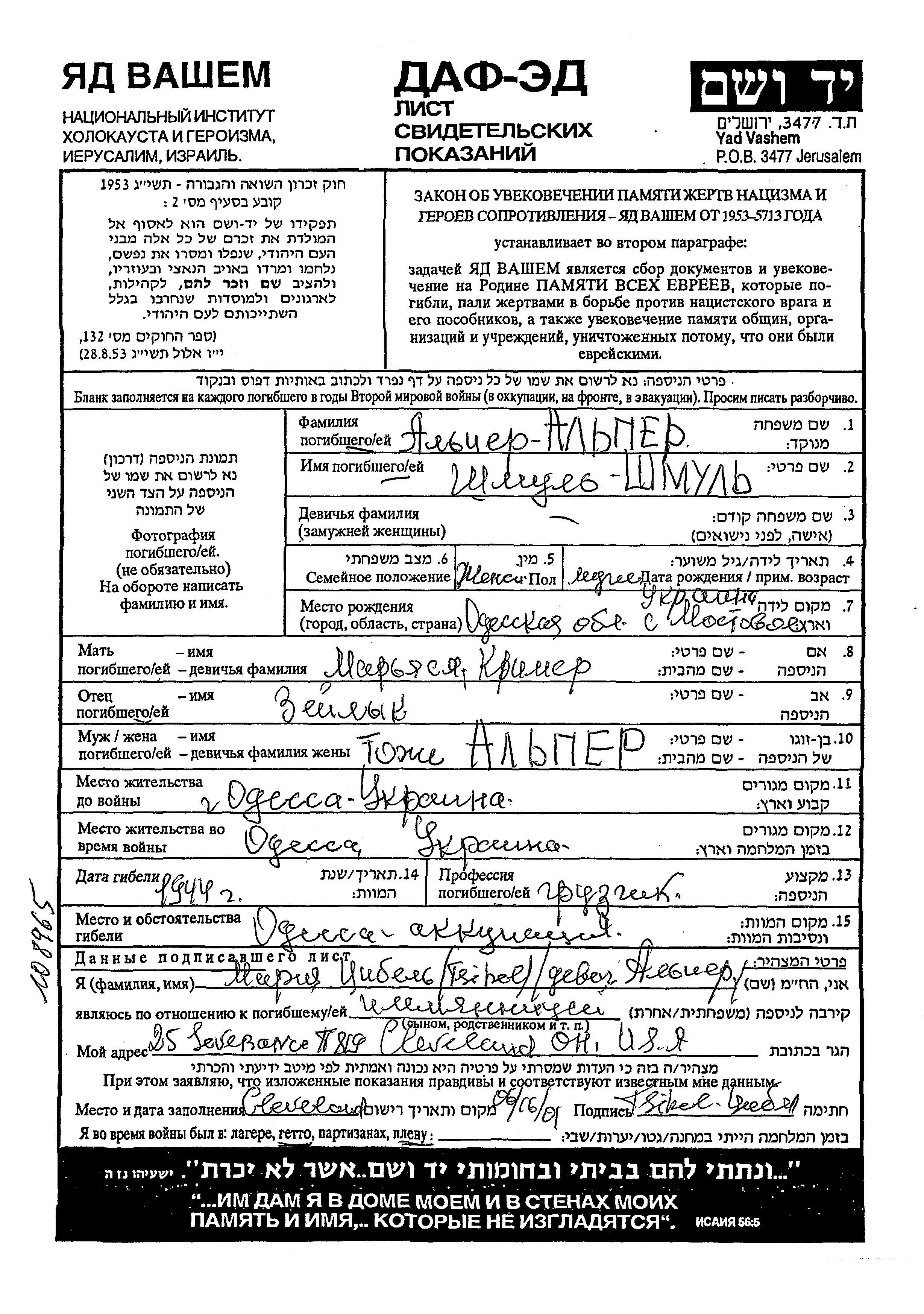 Альпер Эльфер Шмуль Одесса, Украина (СССР) Лист свидетельских показаний