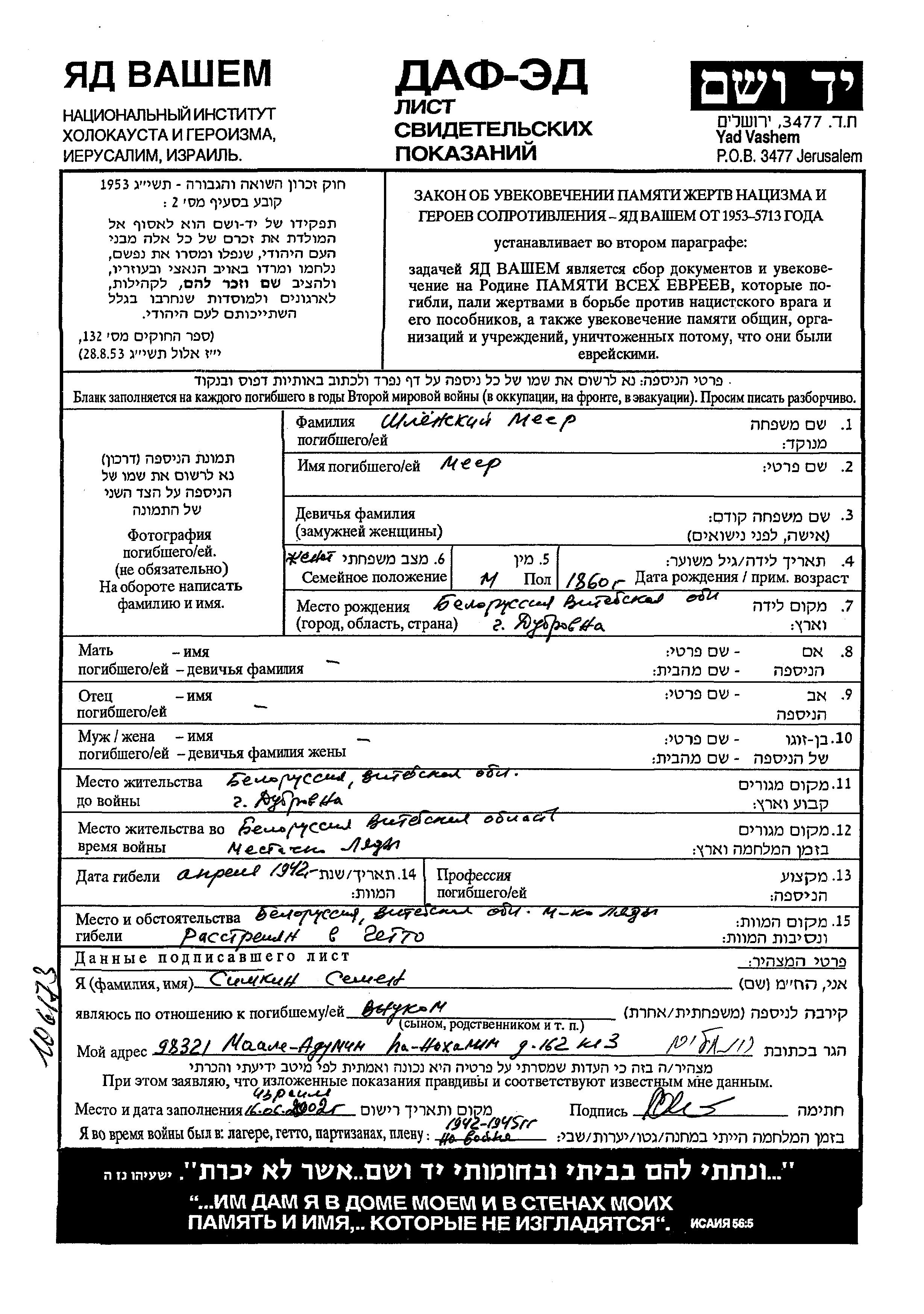 Мейер Шлёнский, место рождения: Дубровна, Белоруссия (СССР). Женат / замужем. Место жительства до войны: Дубровна, Белоруссия (СССР). Место во время войны: Ляды, Белоруссия (СССР).