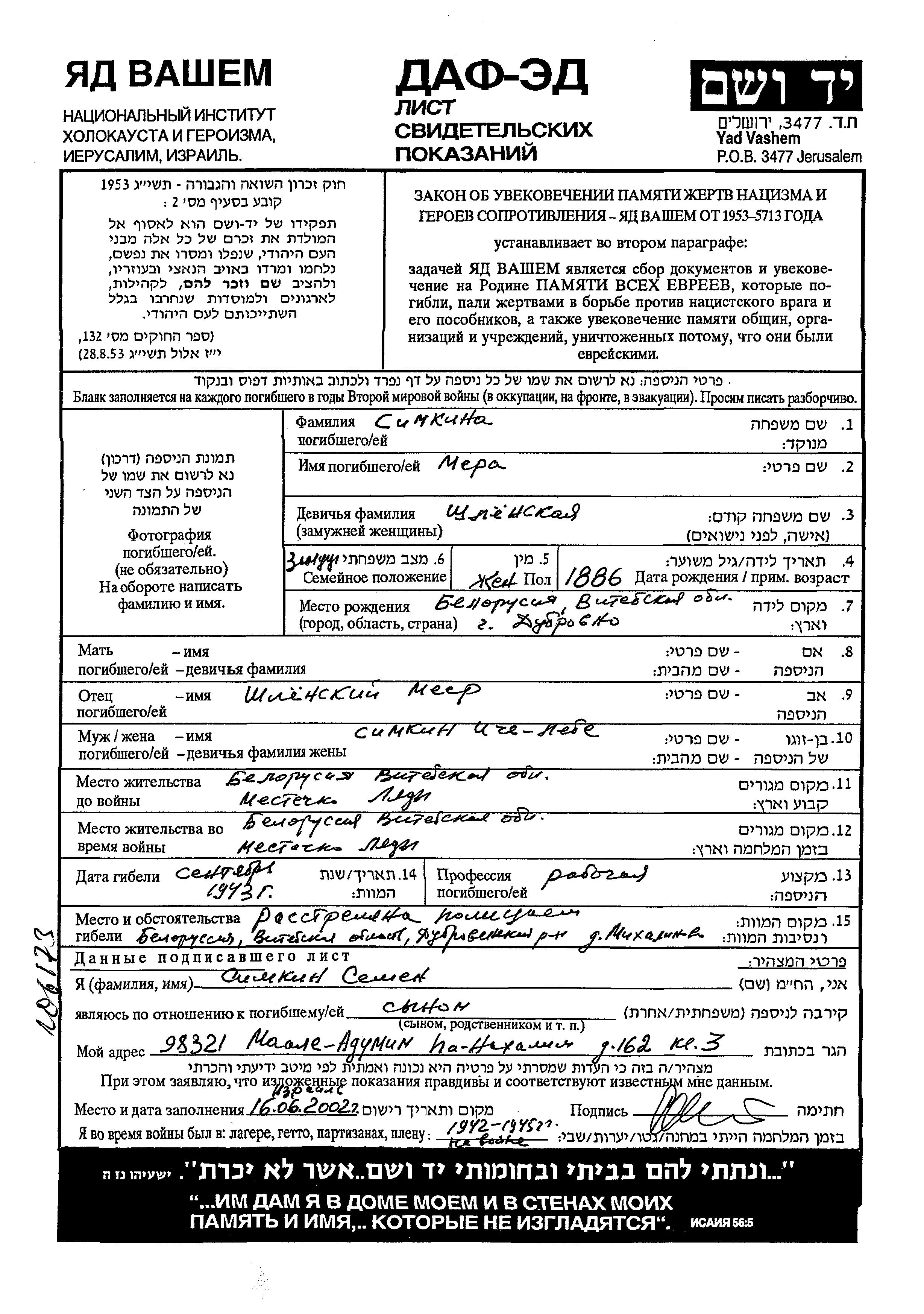 Мера Симкина, девичья фамилия Шлёнская, место рождения: Дубровно, Белоруссия (СССР). Отец: Мейер. Рабочий / рабочая. Женат / замужем. Место жительства до войны: Ляды, Белоруссия (СССР). Место во время войны: Ляды, Белоруссия (СССР).
