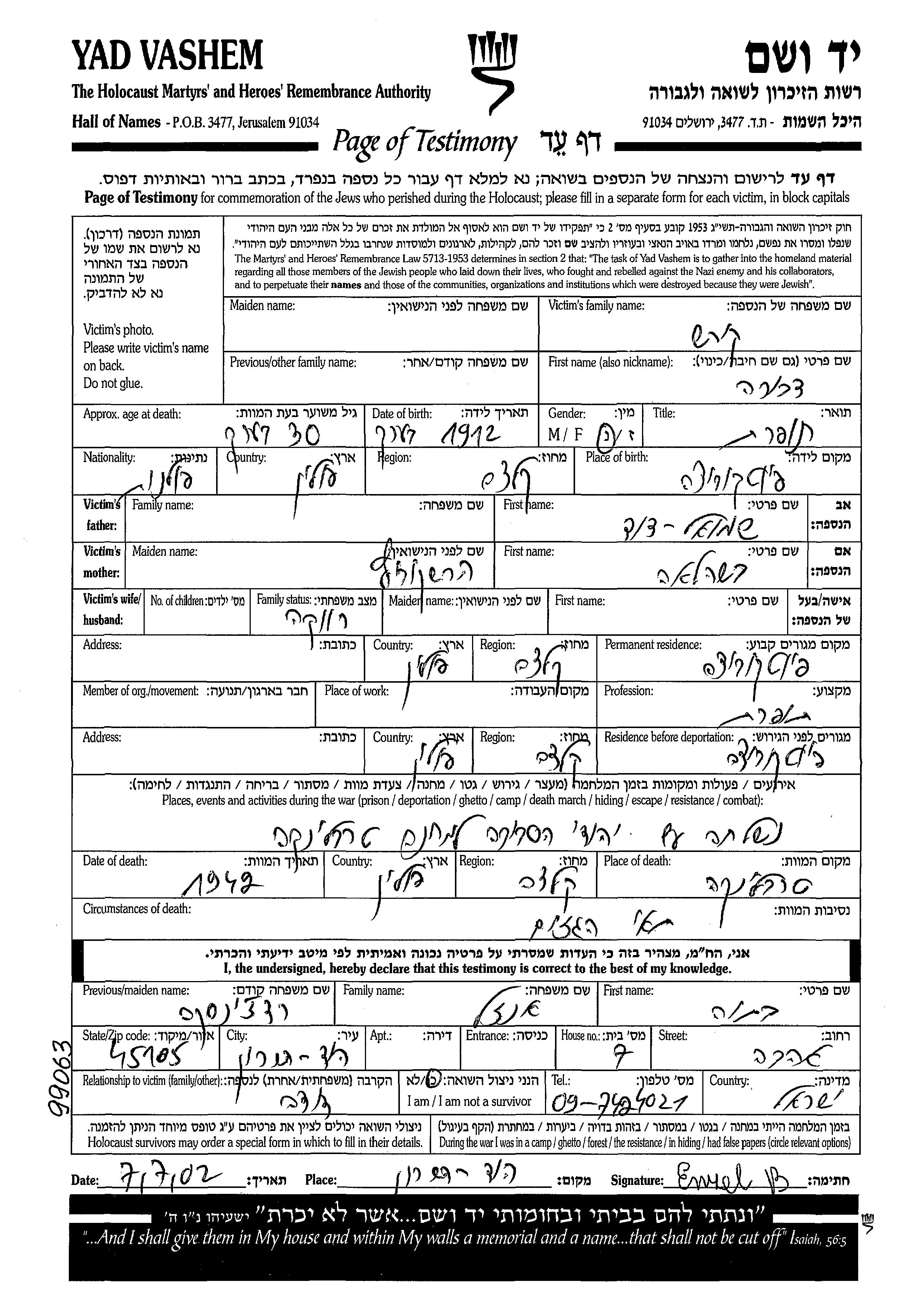 Двора уничтоженa в период Шоа. место смерти: Треблинка, Польша в 1942.