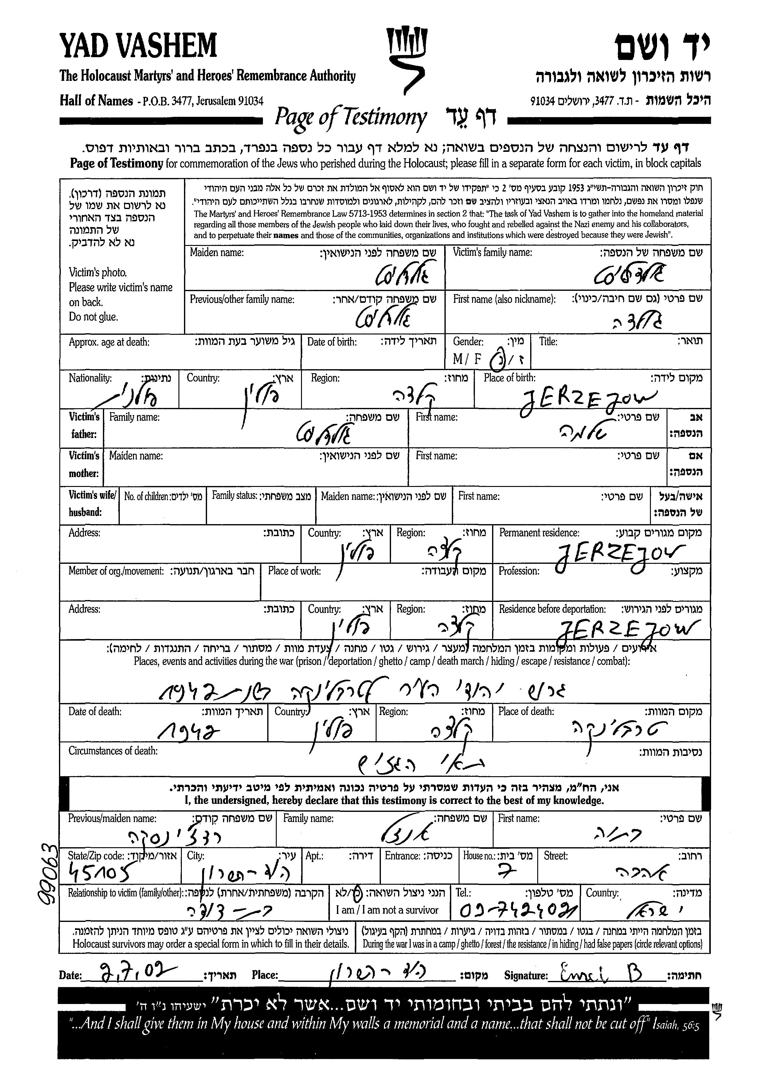 Голда уничтоженa в период Шоа. место смерти: Треблинка, Польша в 1942.