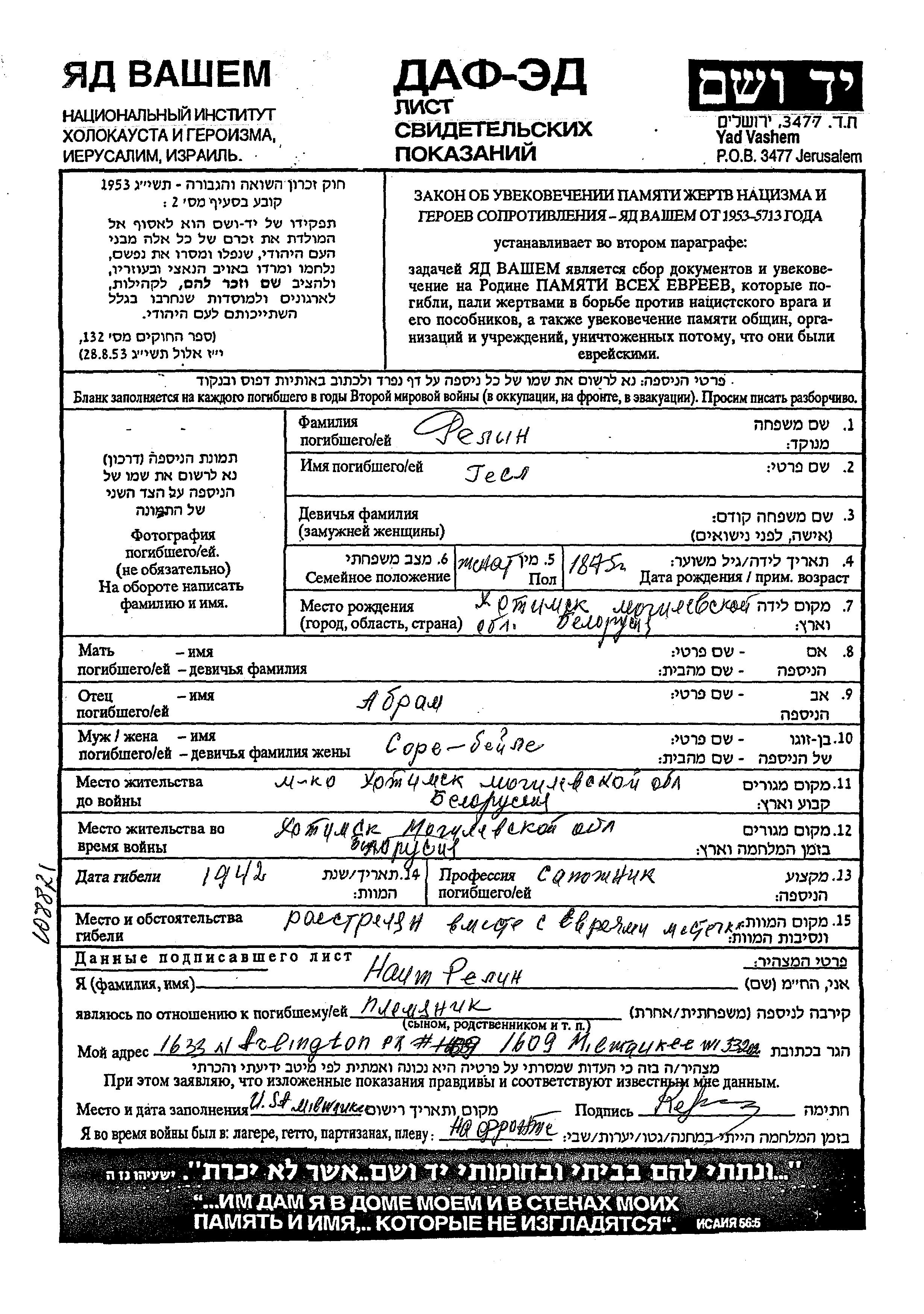 Яд Вашем - Листы свидетельских показаний Мемориального фонда