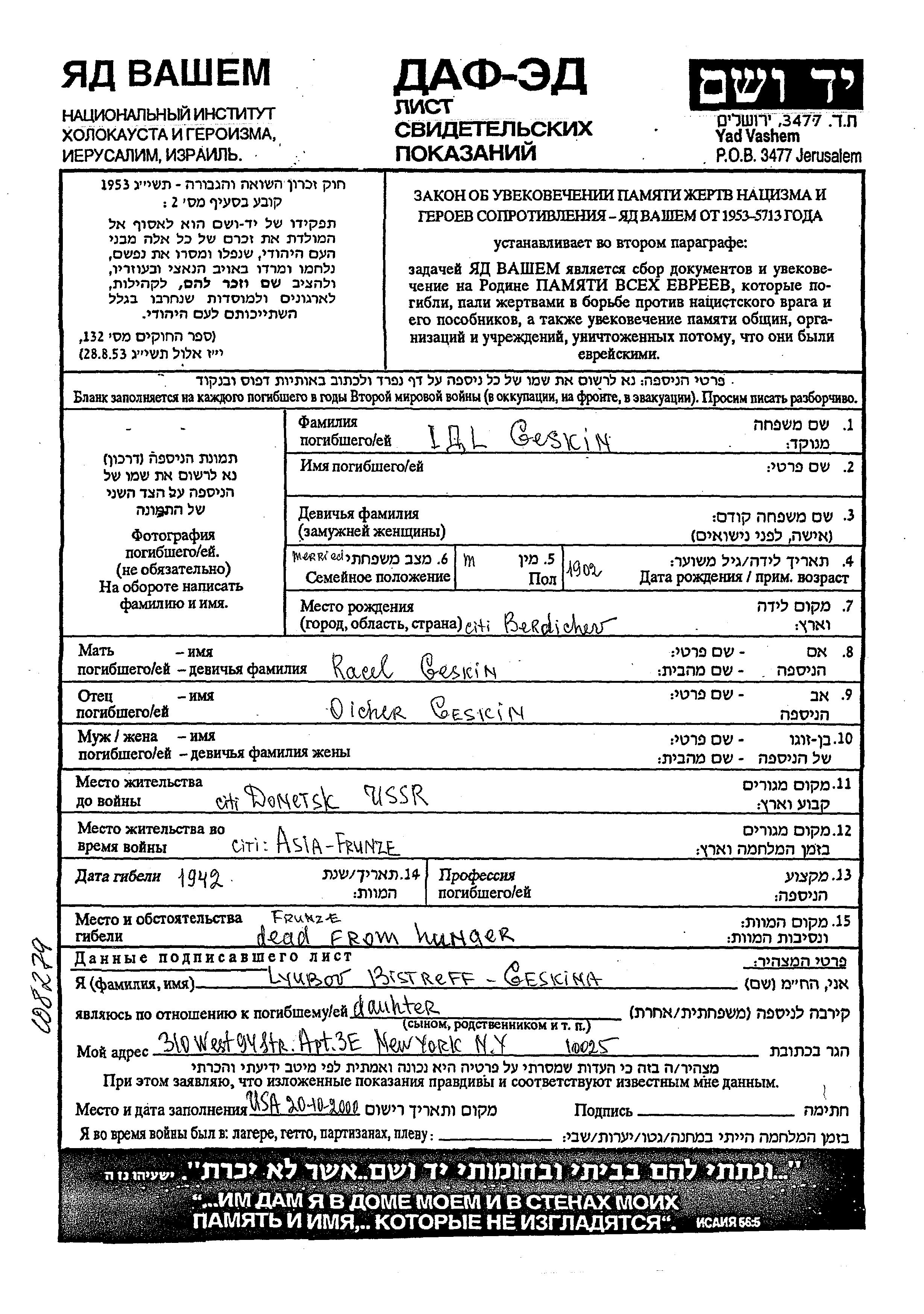 Идл Гескин, место рождения: Бердичев, Украина (СССР). Отец: Ойчер, mать:Рацель. Женат / замужем. Место жительства до войны: Донецк, Украина (СССР). Место во время войны: Фрунзе, Киргизия (СССР). Идл был/а зарегистрирован/а, находясь в эвакуации/ в советском тылу.