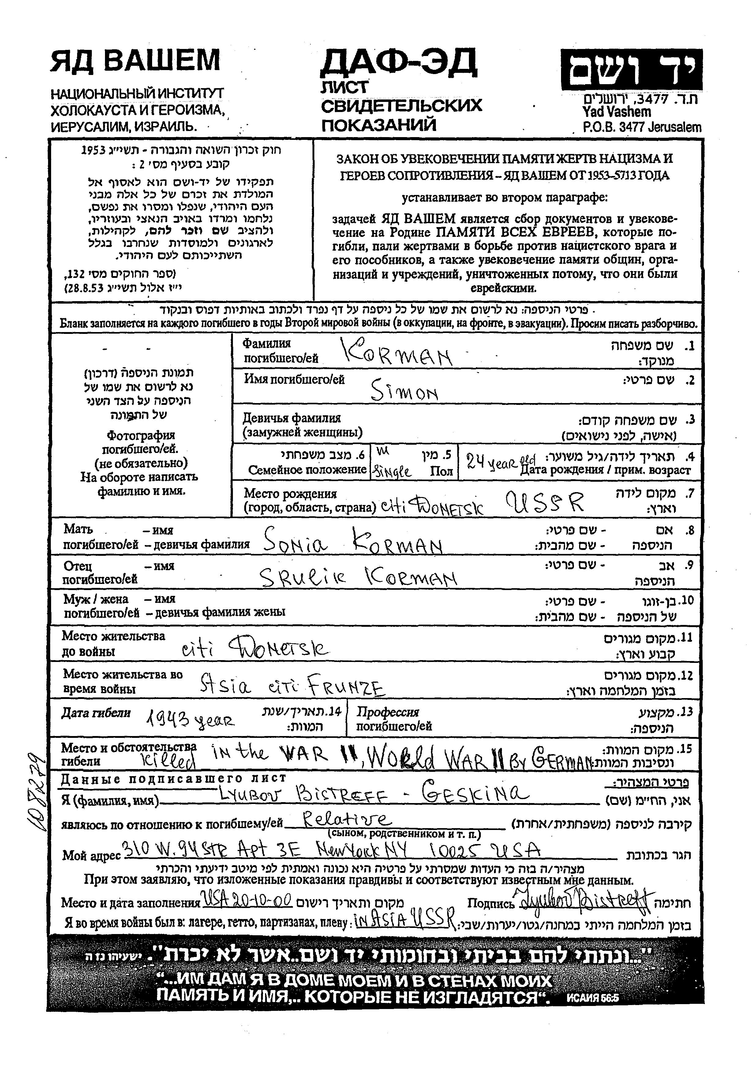 Симон Корман, место рождения: Донецк, Украина (СССР). Отец: Срулик, mать:Соня. Холост / не замужем. Место жительства до войны: Донецк, Украина (СССР). Место во время войны: Вооруженные силы Советского Союза. Симон погиб на военной службе. место смерти: неизвестно в 1943.