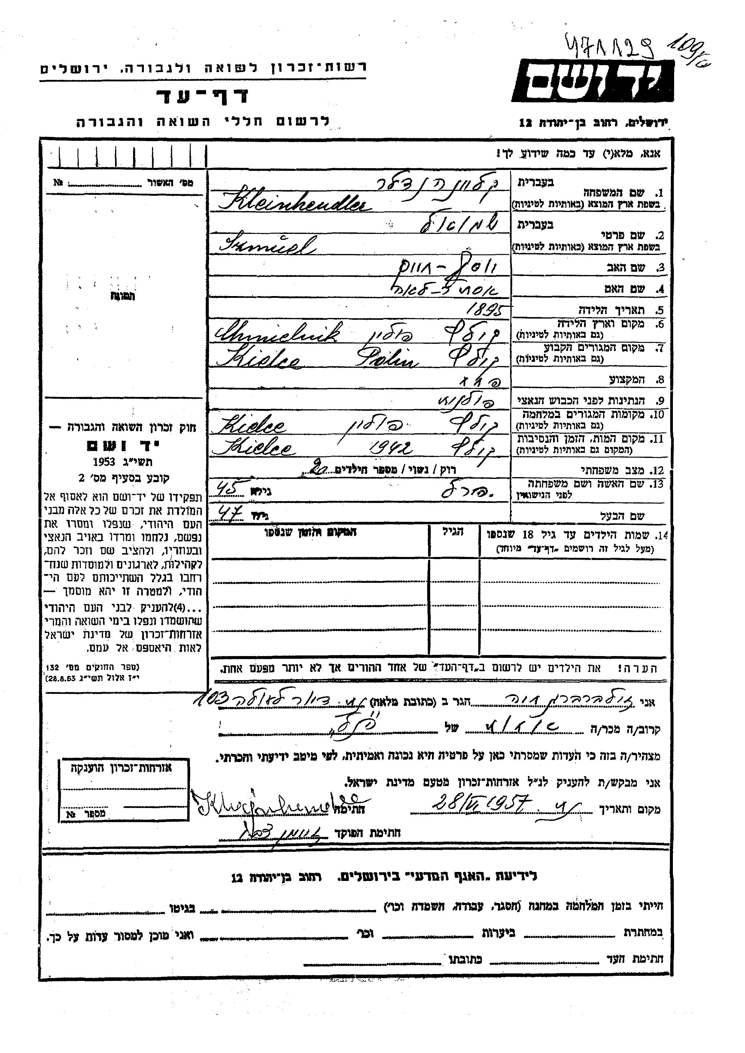 Клейнхендлер Шмуэль 1895 Кельце, Польша Лист свидетельских показаний