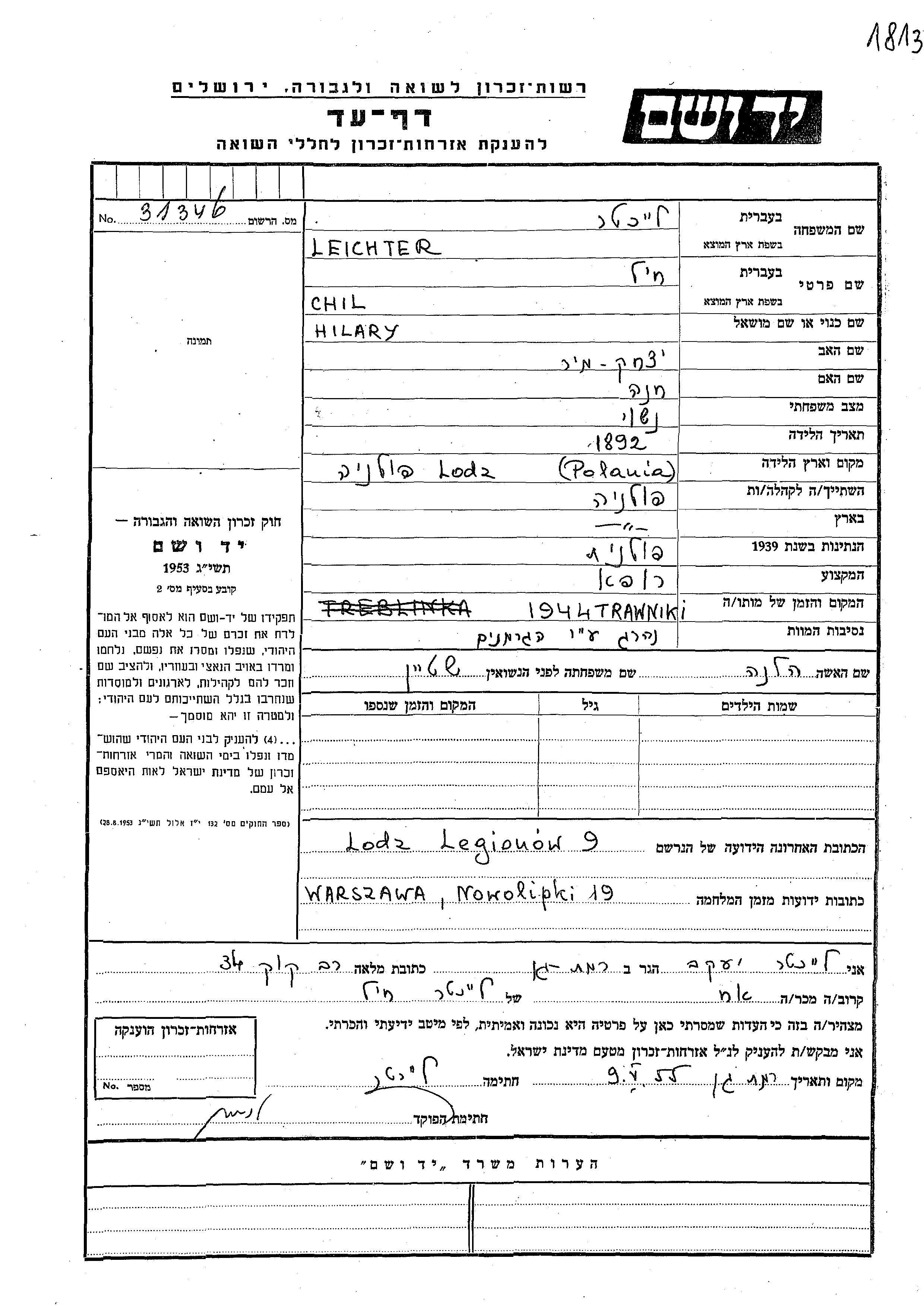 Хиль Лейхтер, место рождения: Лодзь, Польша. Отец: Ицхак Р, mать:Хана. Врач. Место жительства до войны: Польша. Место во время войны: Варшава, Польша.