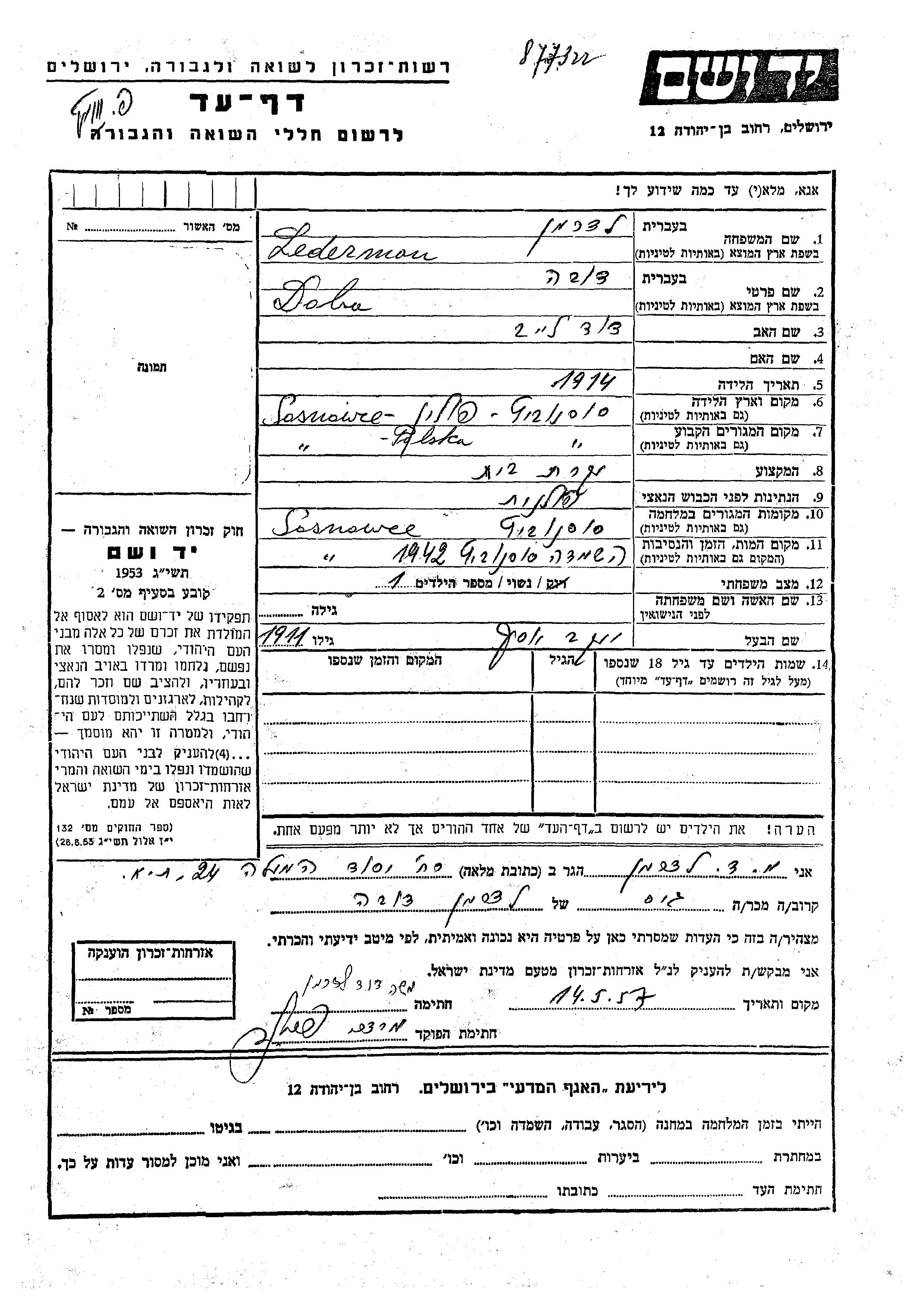 Доба Ледерман, место рождения: Сосновец, Польша. Отец: Давид Лейб. Домохозяйка. Женат / замужем. Место жительства до войны: Сосновец, Польша. Место во время войны: Сосновец, Польша.