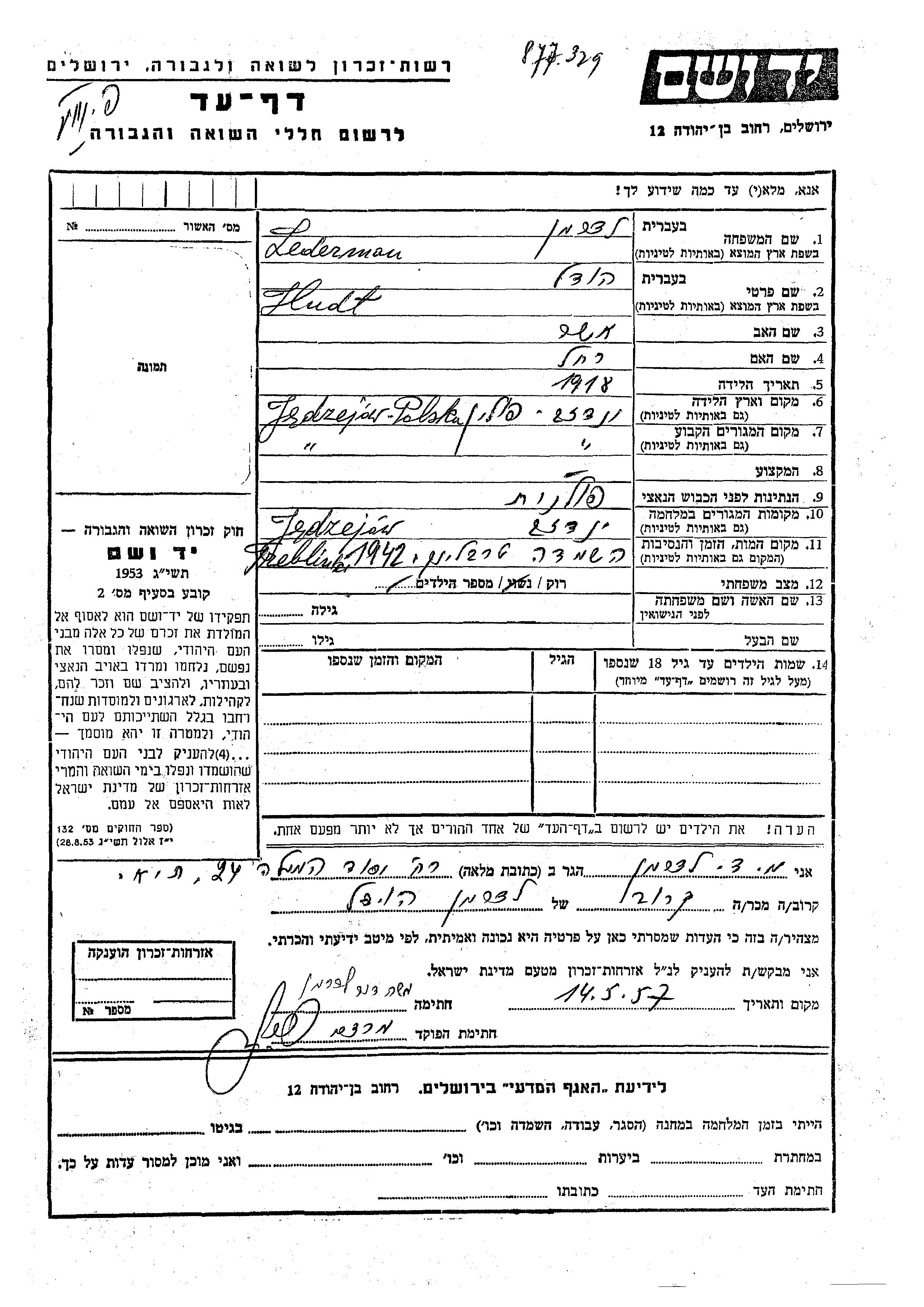 Худль Ледерман, место рождения: Енджеюв, Польша. Отец: Ашер, mать:Рахель. Холост / не замужем. Место жительства до войны: Енджеюв, Польша. Место во время войны: Енджеюв, Польша.