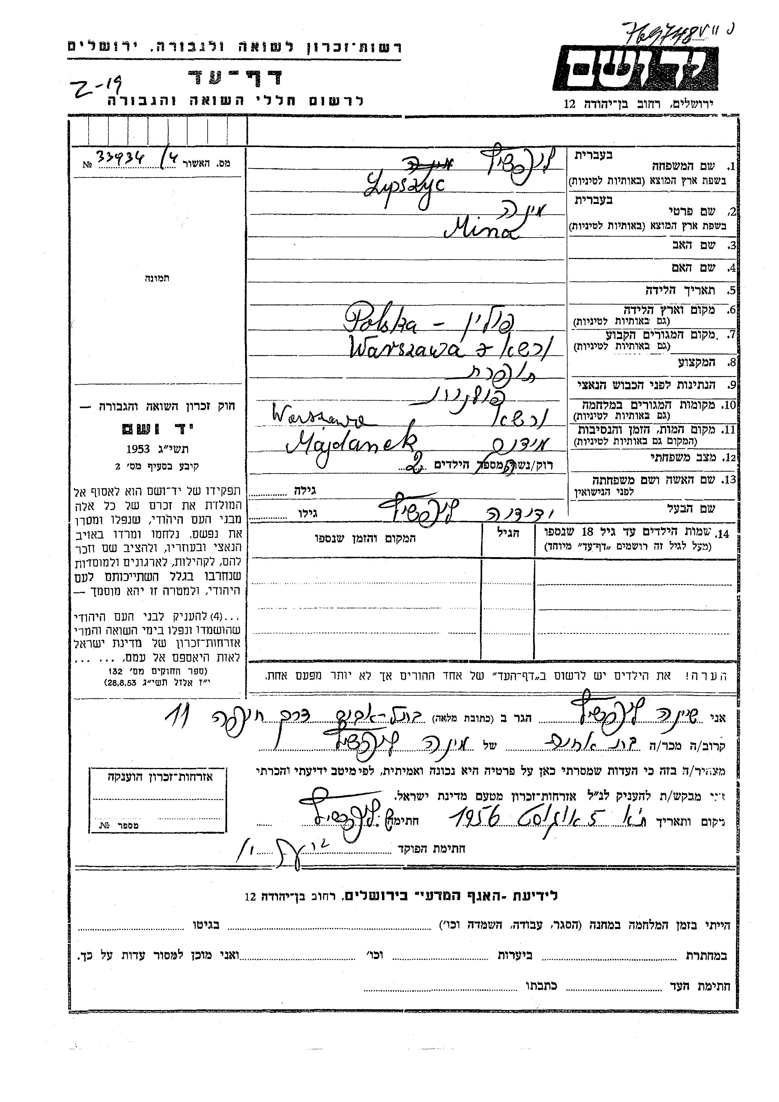 Липшиц Мина Варшава, Польша Лист свидетельских показаний