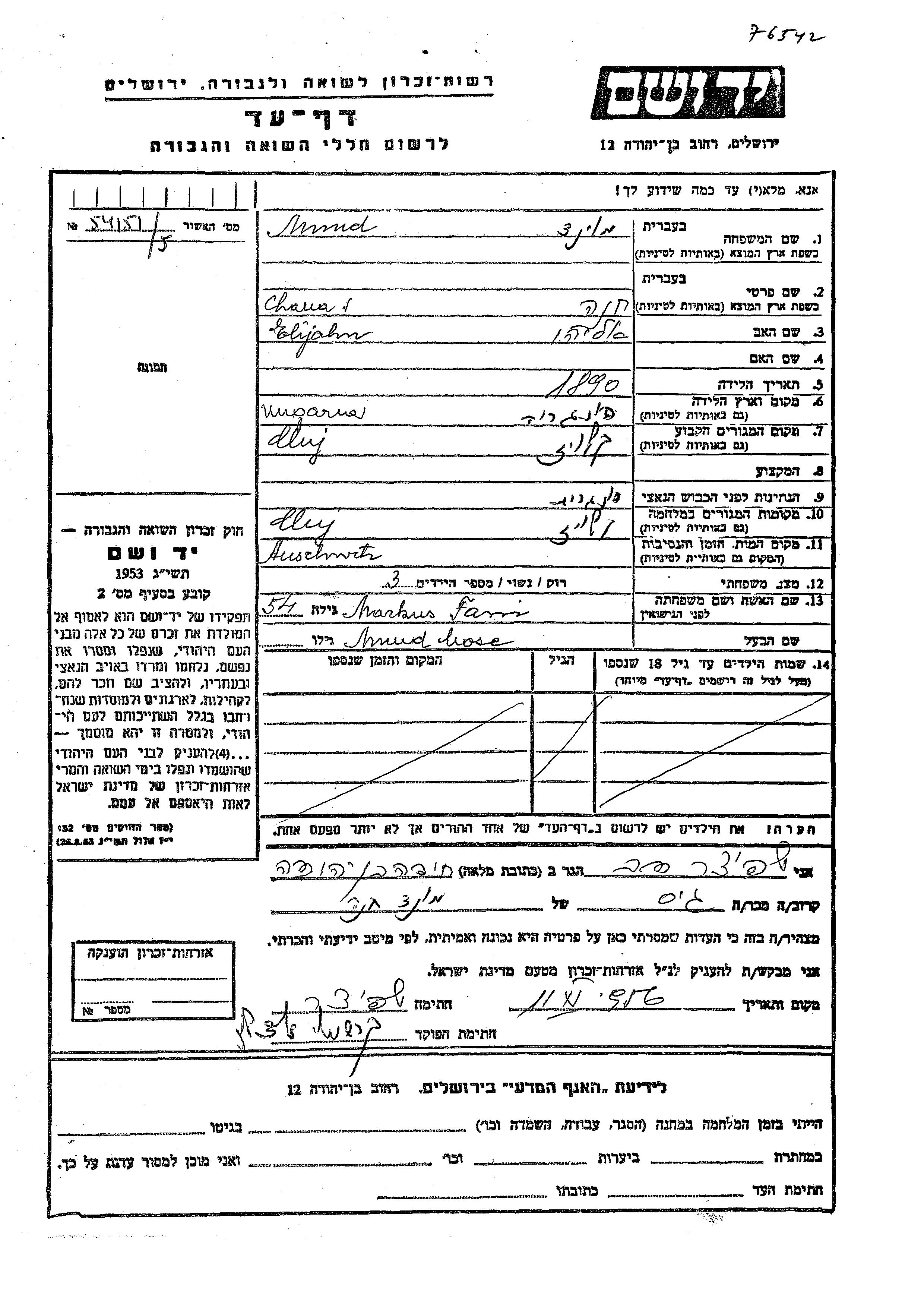 Хана Фани Мунд Монд, девичья фамилия Маркус, место рождения: Венгрия. Отец: Элияху. Женат / замужем. Место жительства до войны: Клуж, Румыния. Место во время войны: Клуж, Румыния.