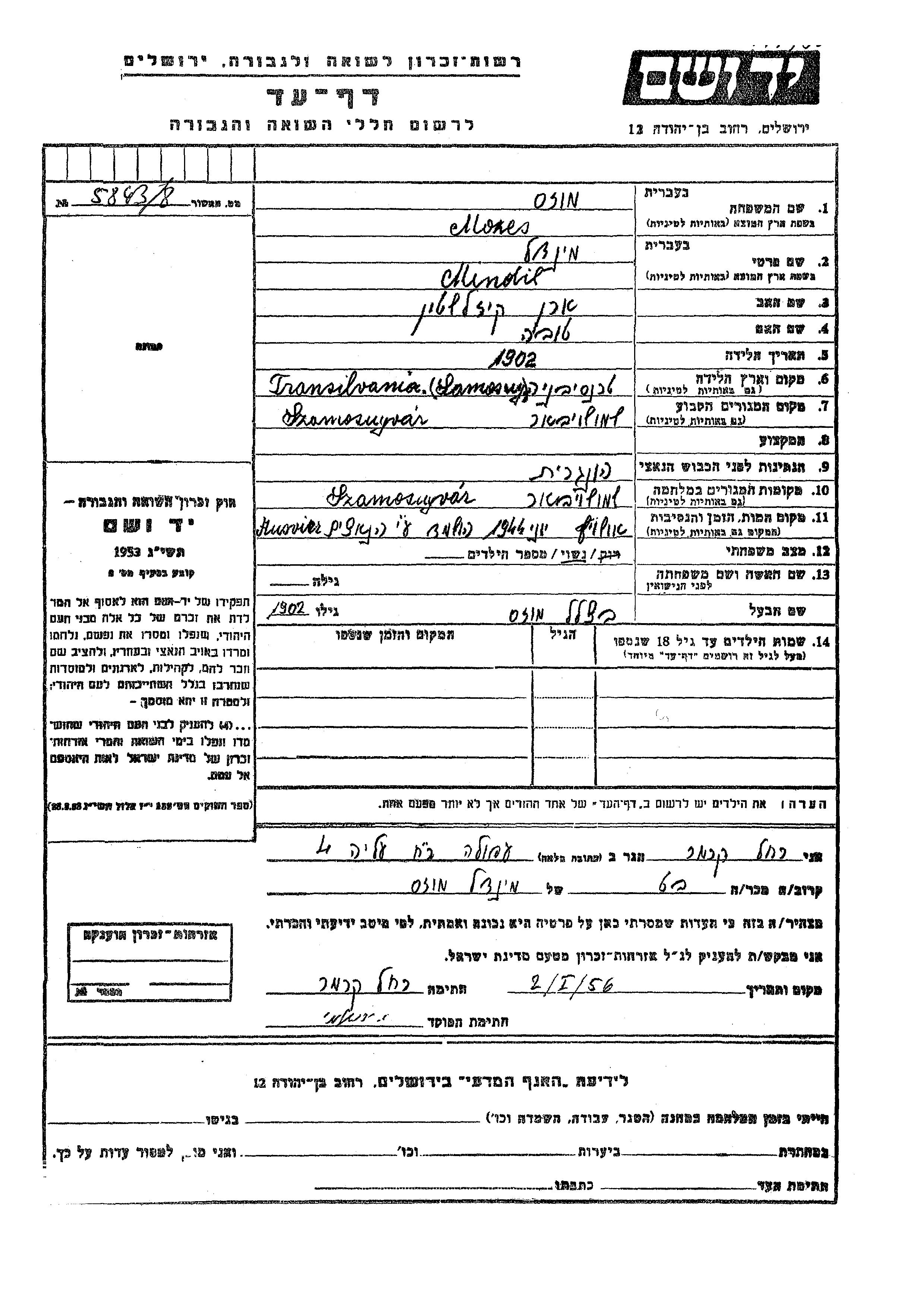 Мозес Миндил 1902 Самошуйвар, Румыния Лист свидетельских показаний
