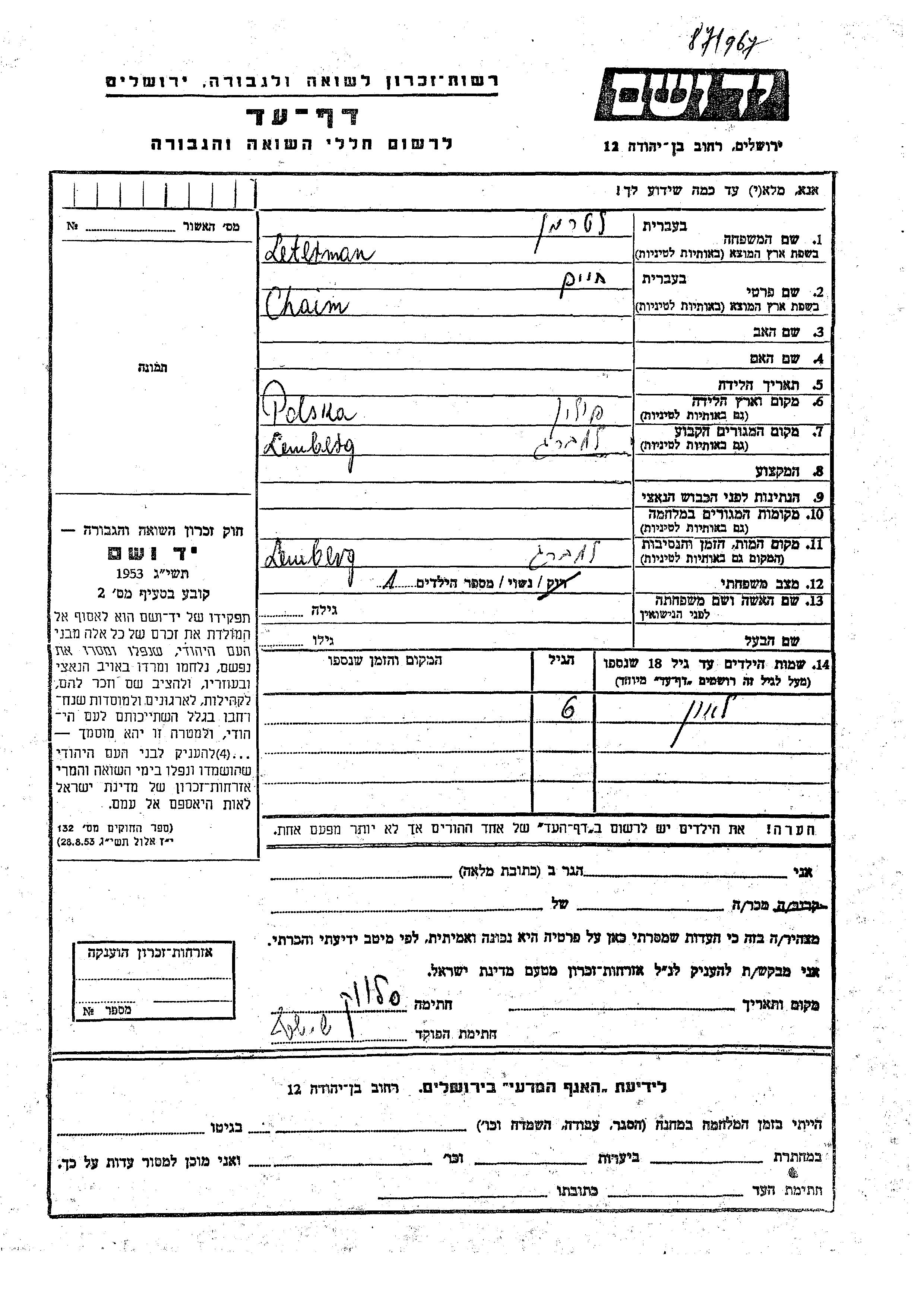 Летерман Хаим Лемберг, Польша Лист свидетельских показаний