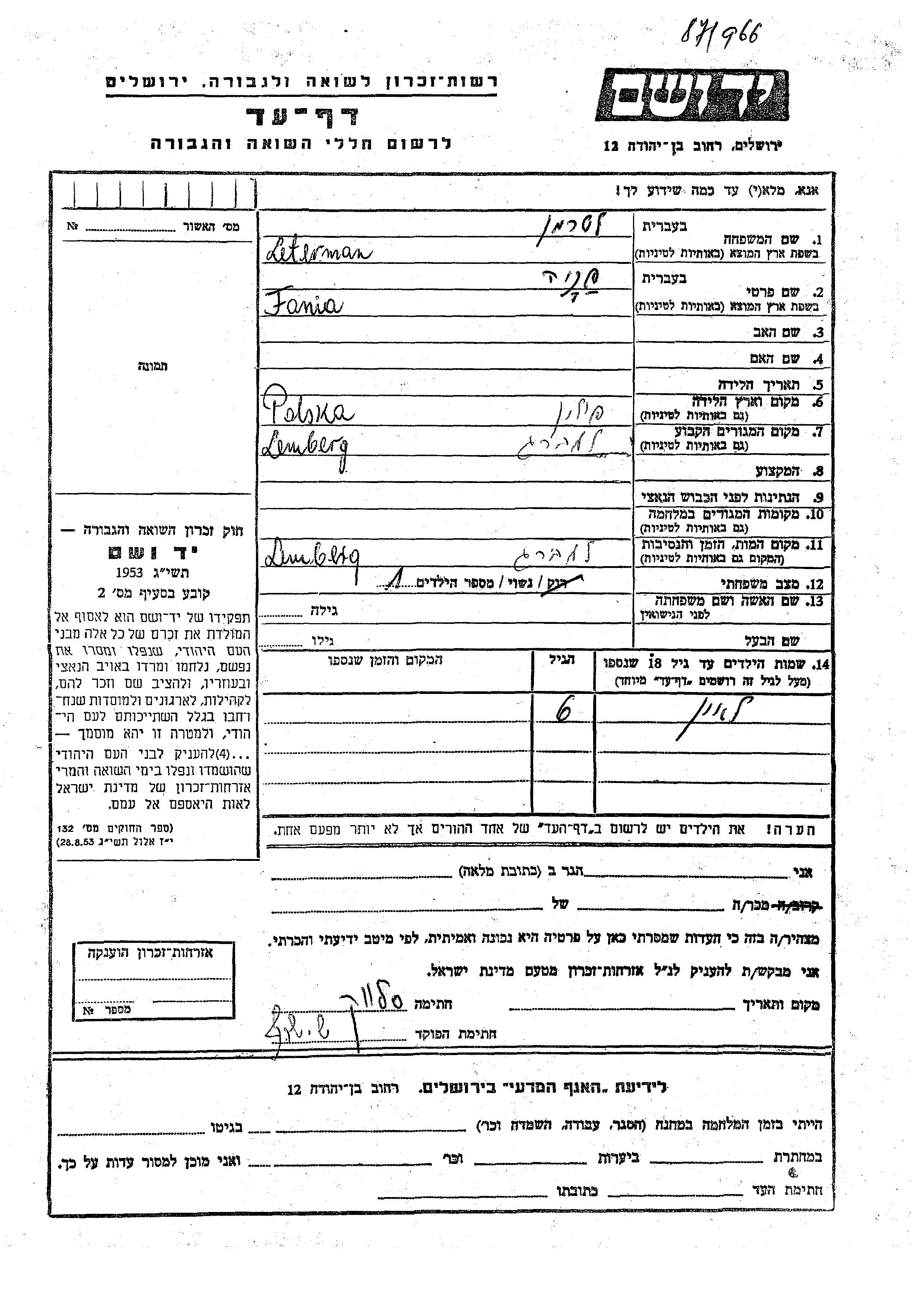 Летерман Фаня Лемберг, Польша Лист свидетельских показаний