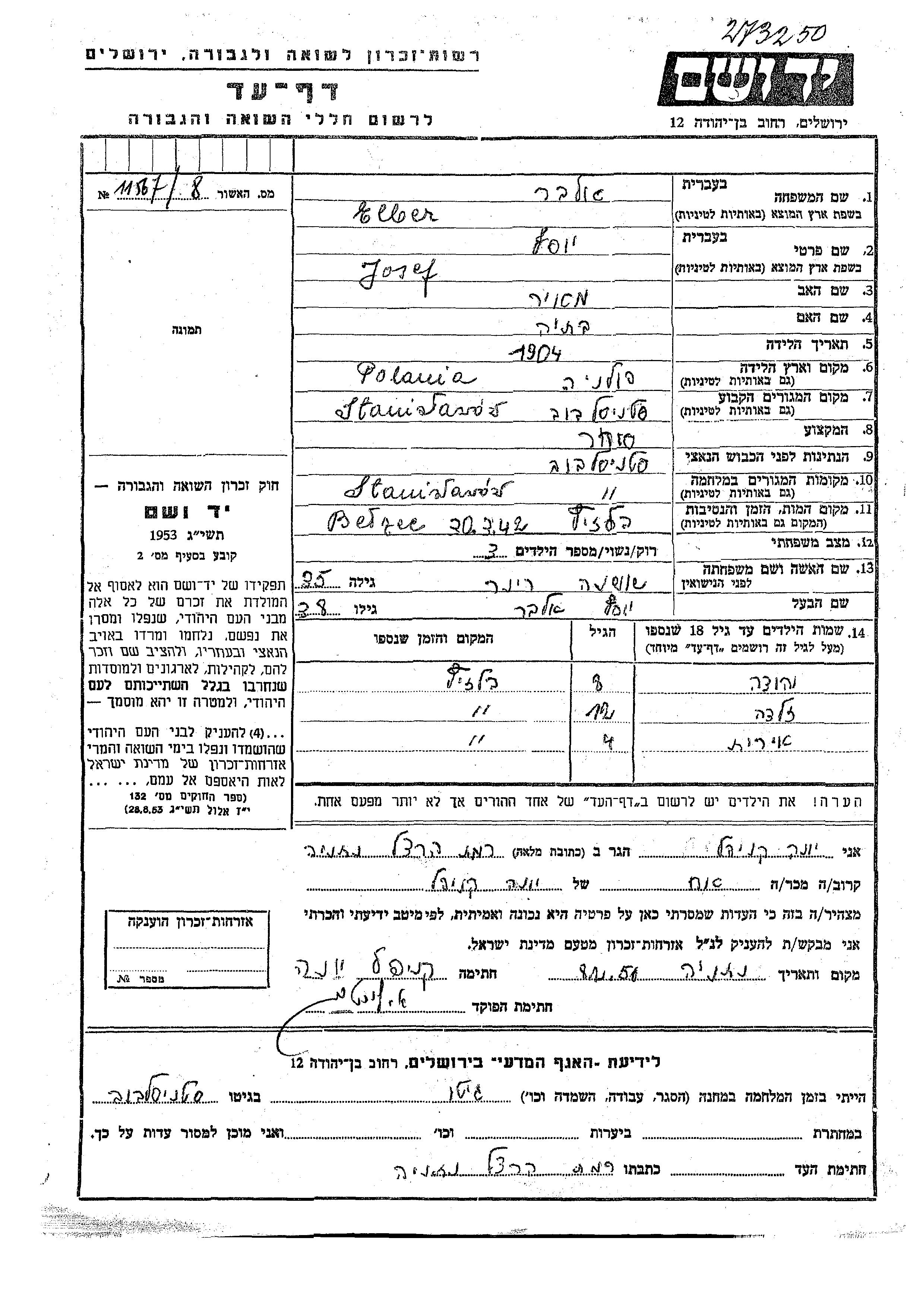 Эльбер Йосеф 1904 Станиславув, Польша Лист свидетельских показаний
