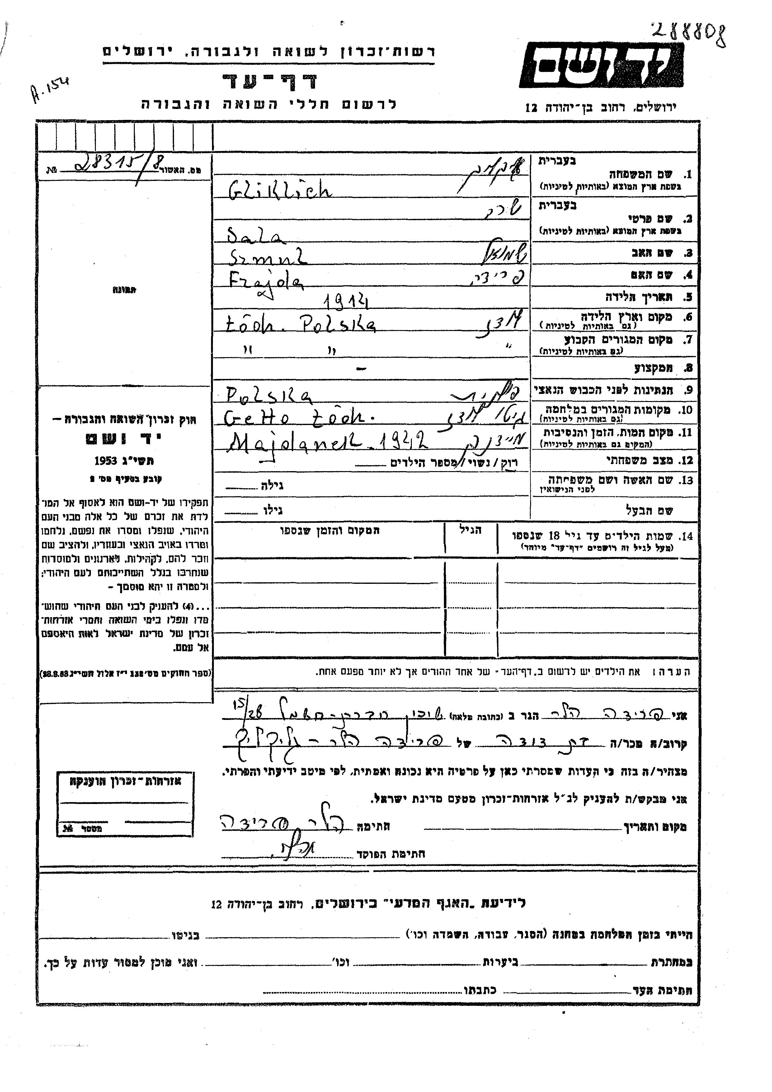 Гликлих Сара 1914 Лодзь, Польша Лист свидетельских показаний