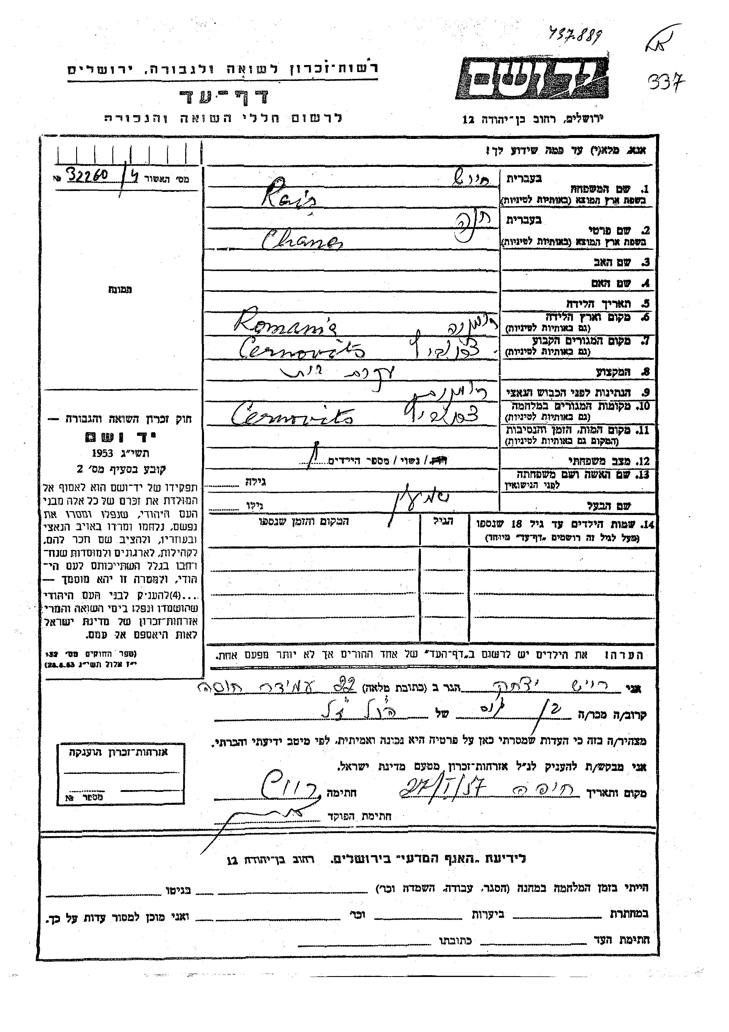 Райс Рейш Хана Черновицы, Румыния Лист свидетельских показаний