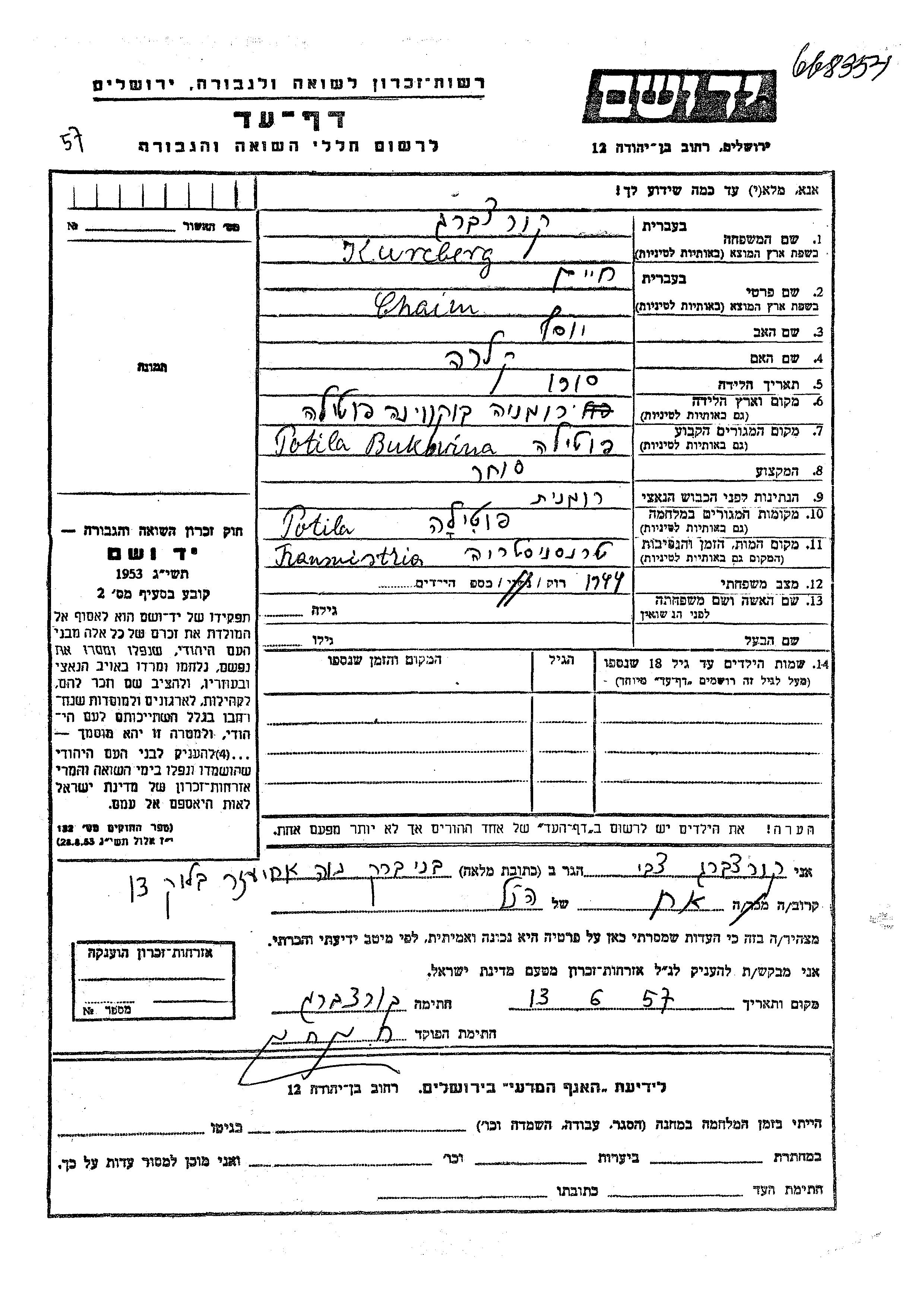 Курцберг Хаим 1910 Потила, Румыния Лист свидетельских показаний