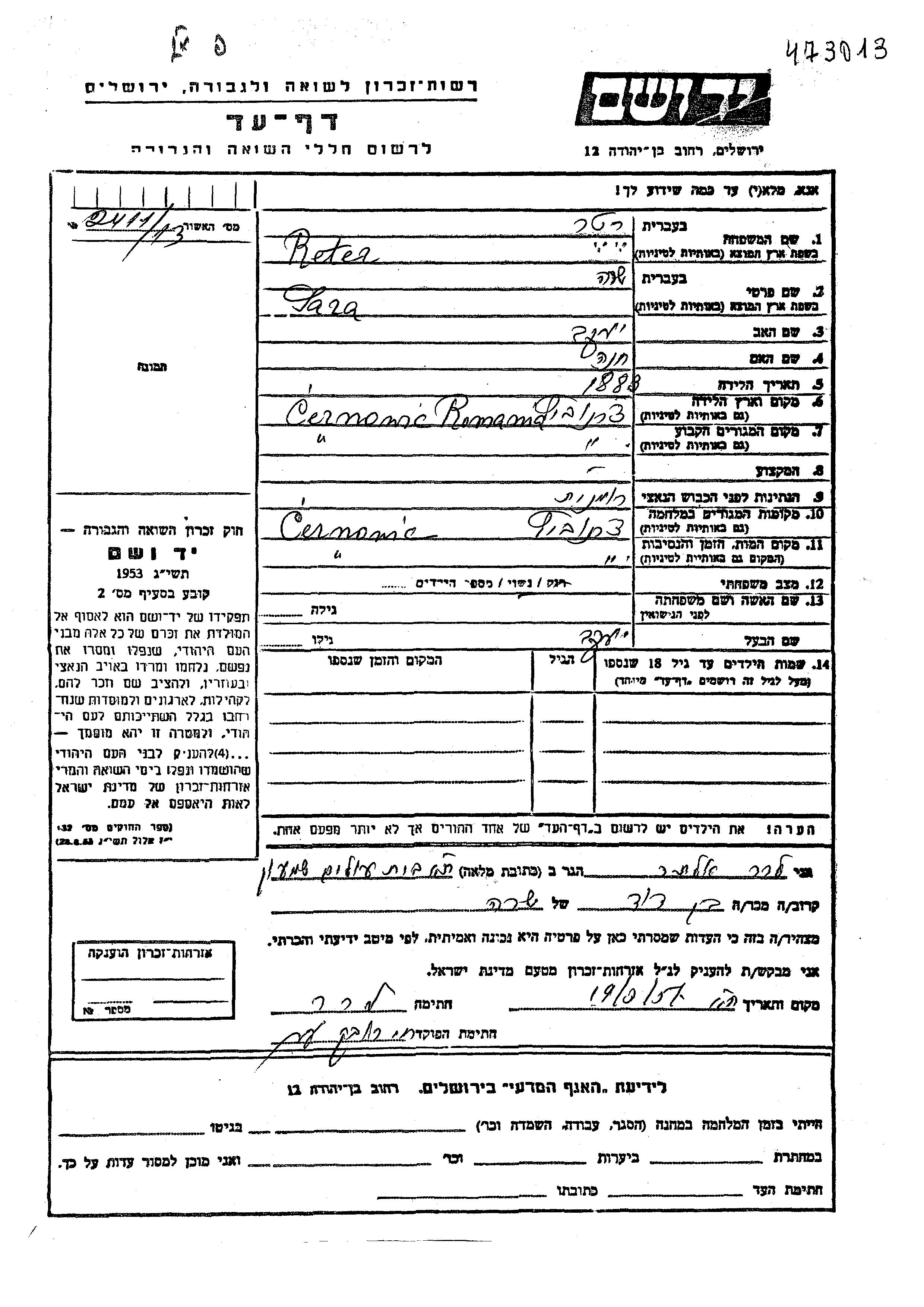 Ретер Сара 1883 Черновцы, Румыния Лист свидетельских показаний