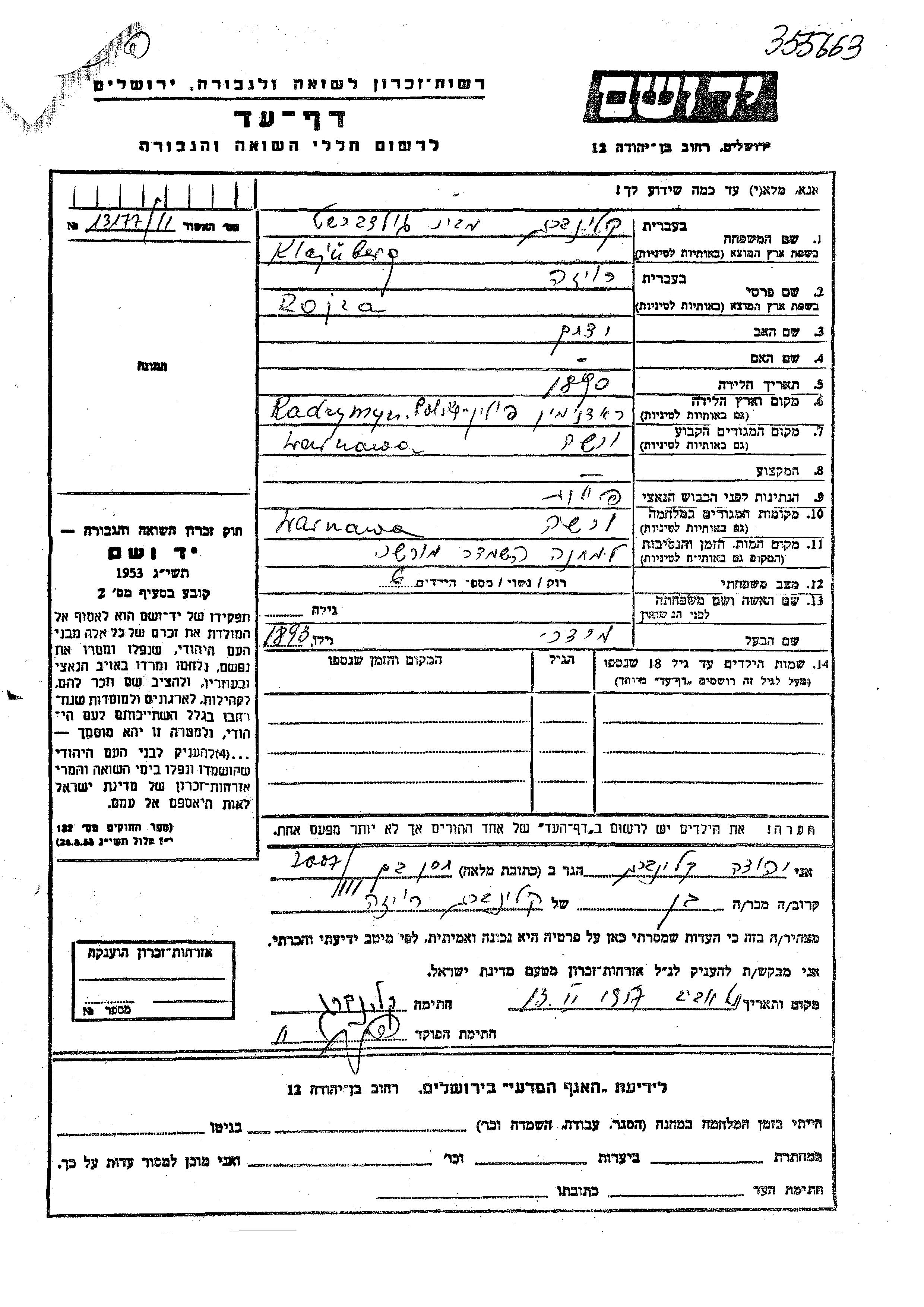 Ройза Клайнберг Клинберг, девичья фамилия Гольдбаршт, место рождения: Радзымин, Польша. Отец: Ицхак. Женат / замужем. Место жительства до войны: Варшава, Польша. Место во время войны: Варшава, Польша.