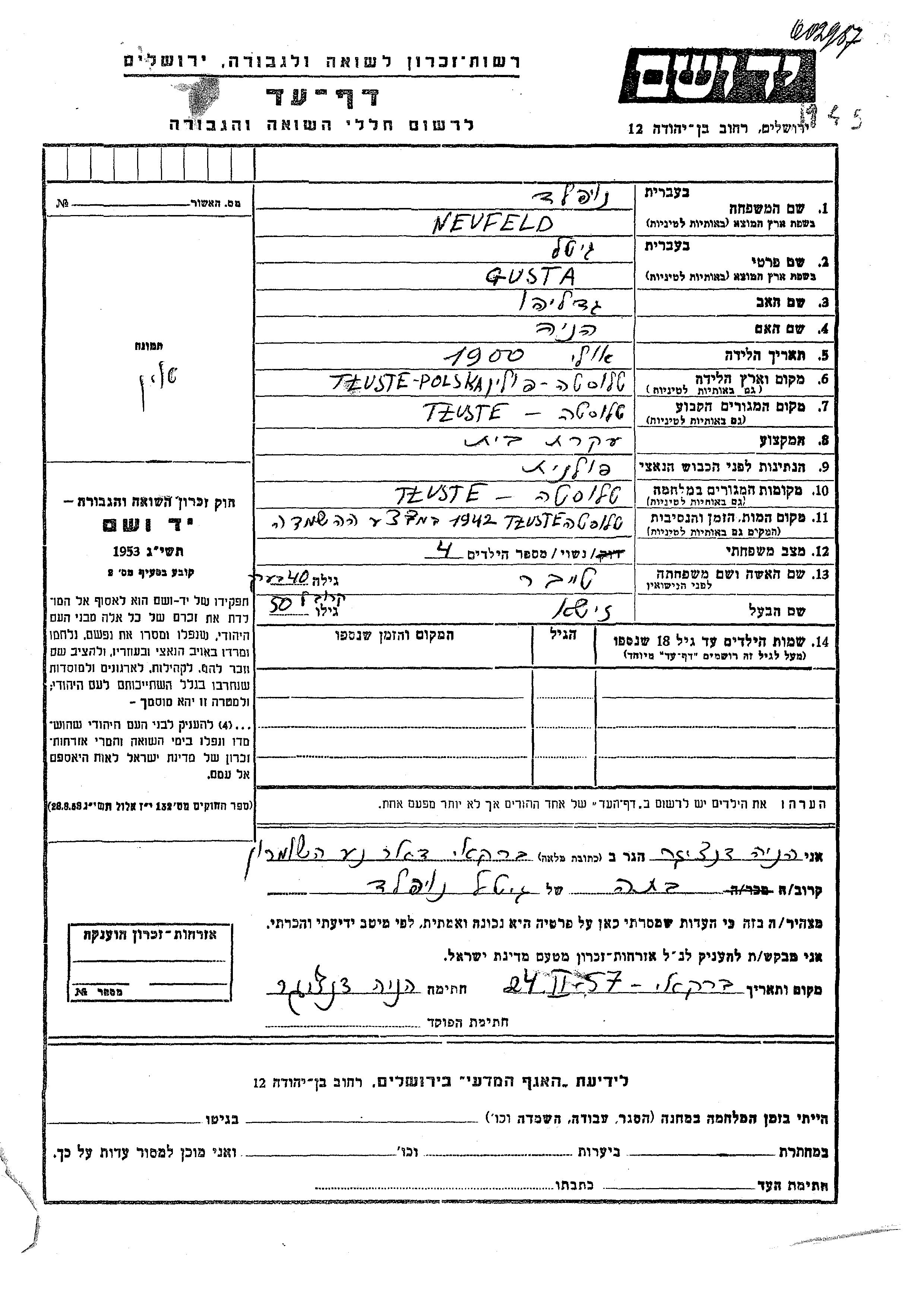 Густа Гитель Нойфельд, девичья фамилия Тейбер, место рождения: Тлусте, Польша. Отец: Гдальягу, mать:Хеня. Домохозяйка. Женат / замужем. Место жительства до войны: Тлусте, Польша. Место во время войны: Тлусте, Польша.