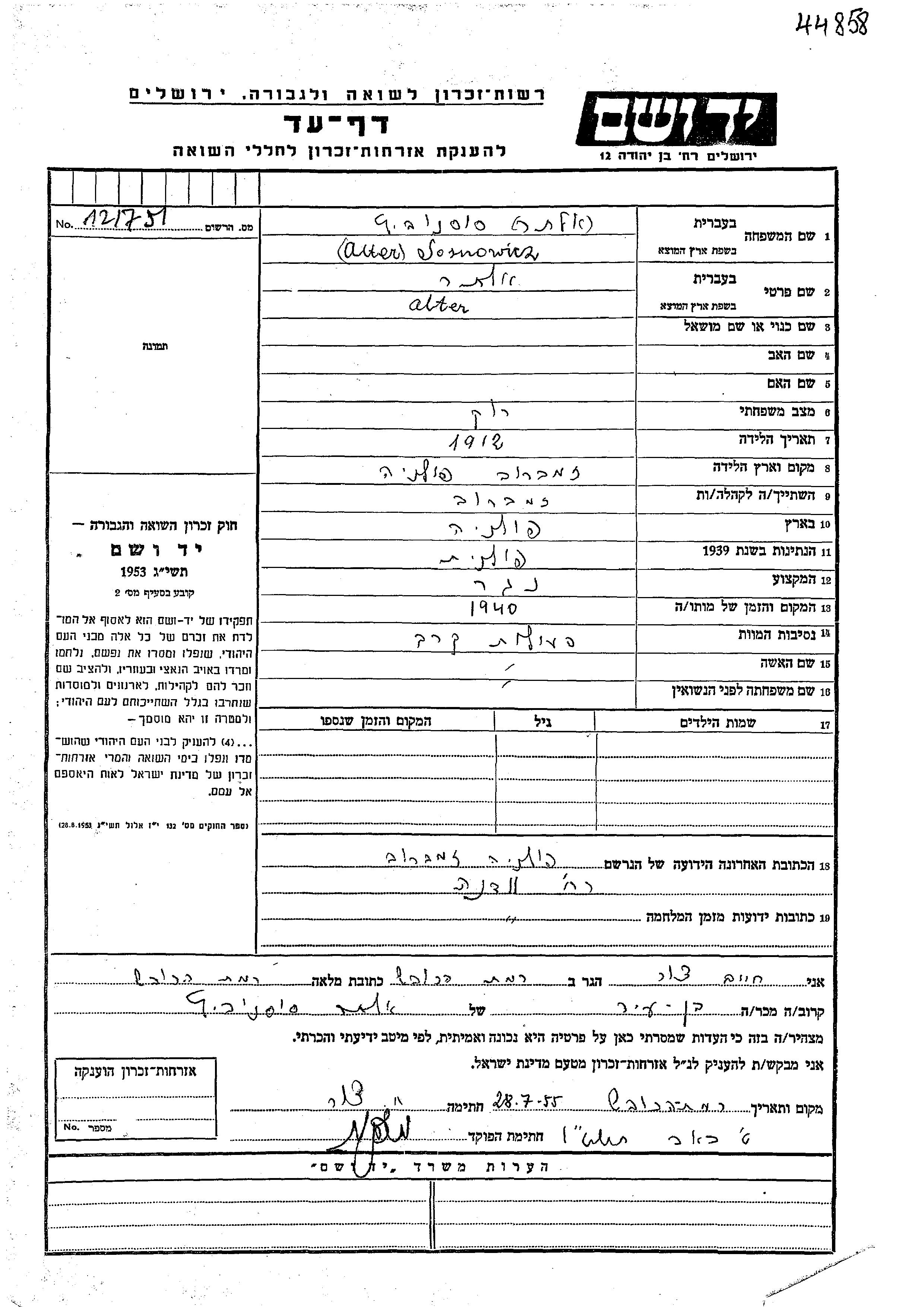Соснович Алтер 1912 Замбрув, Польша Лист свидетельских показаний