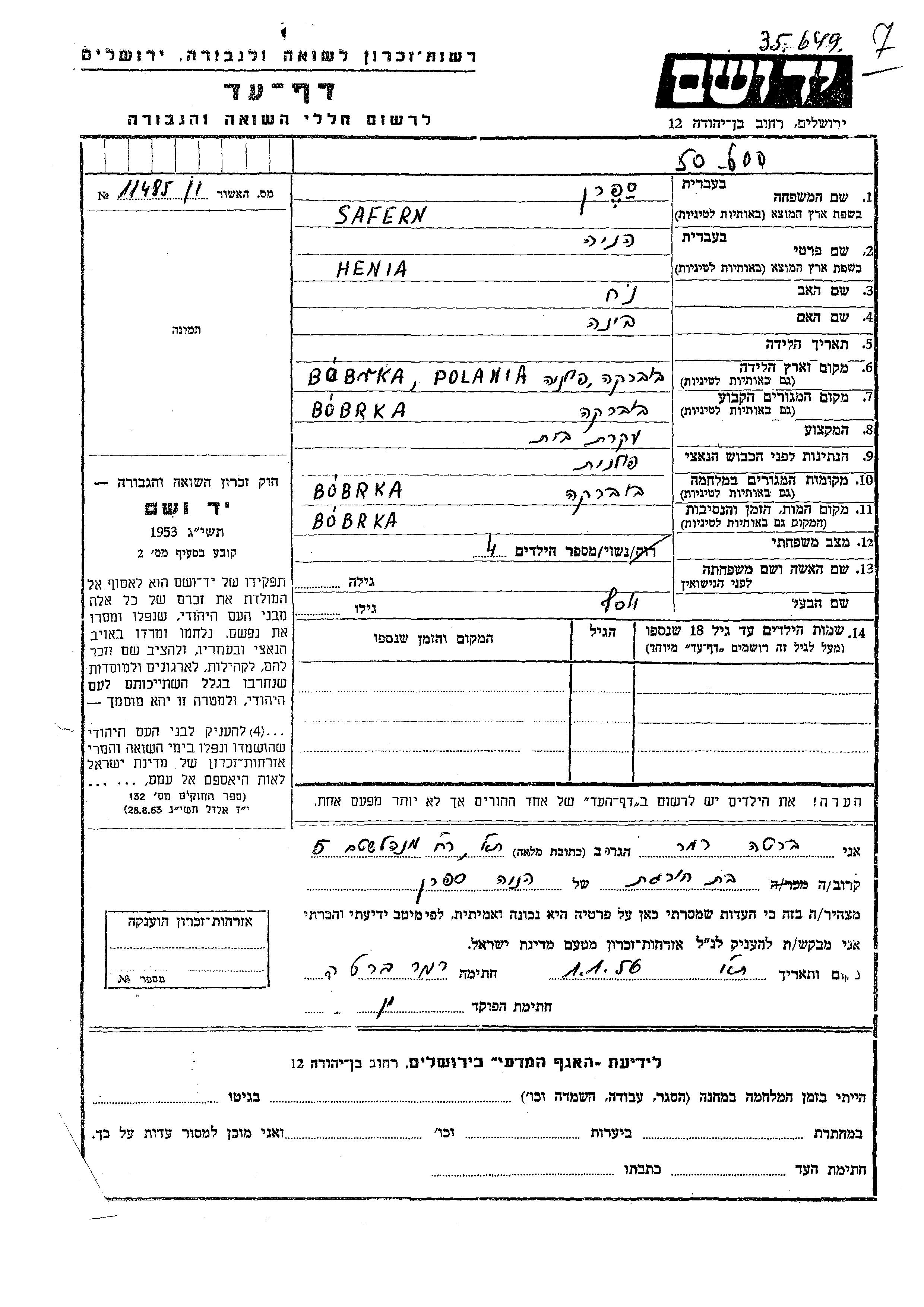 Хеня Саферн Сафран, место рождения: Бобрка, Польша. Отец: Ноах, mать:Бина. Домохозяйка. Женат / замужем. Место жительства до войны: Бобрка, Польша. Место во время войны: Бобрка, Польша.