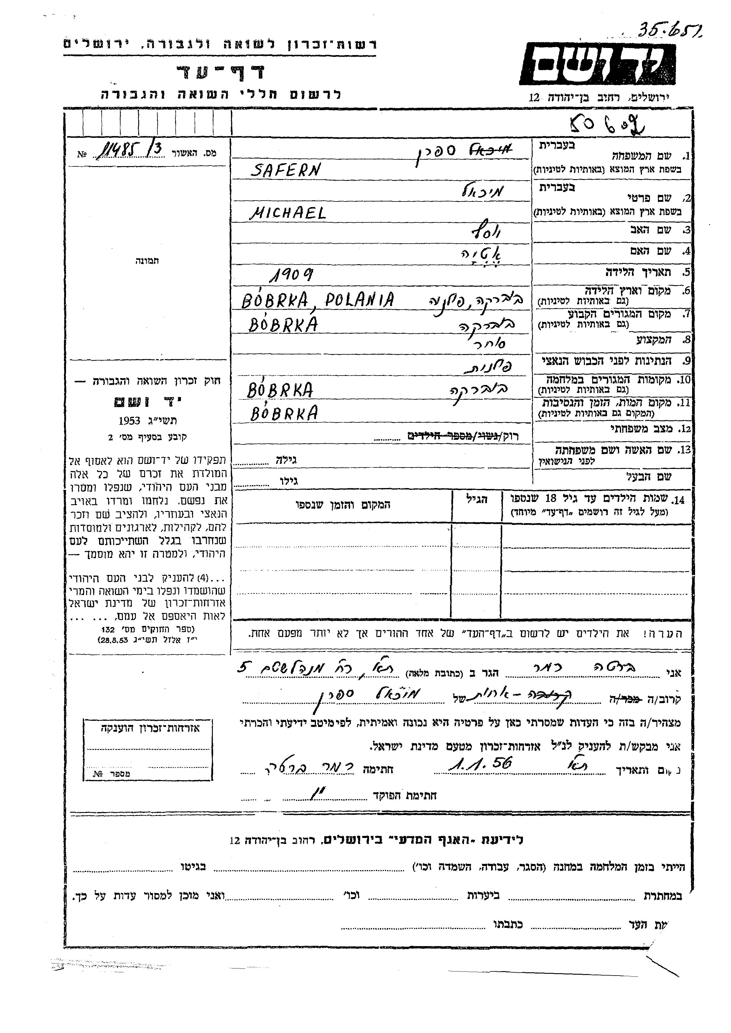 Саферн Сафран Михаэль 1909 Бобрка, Польша Лист свидетельских показаний