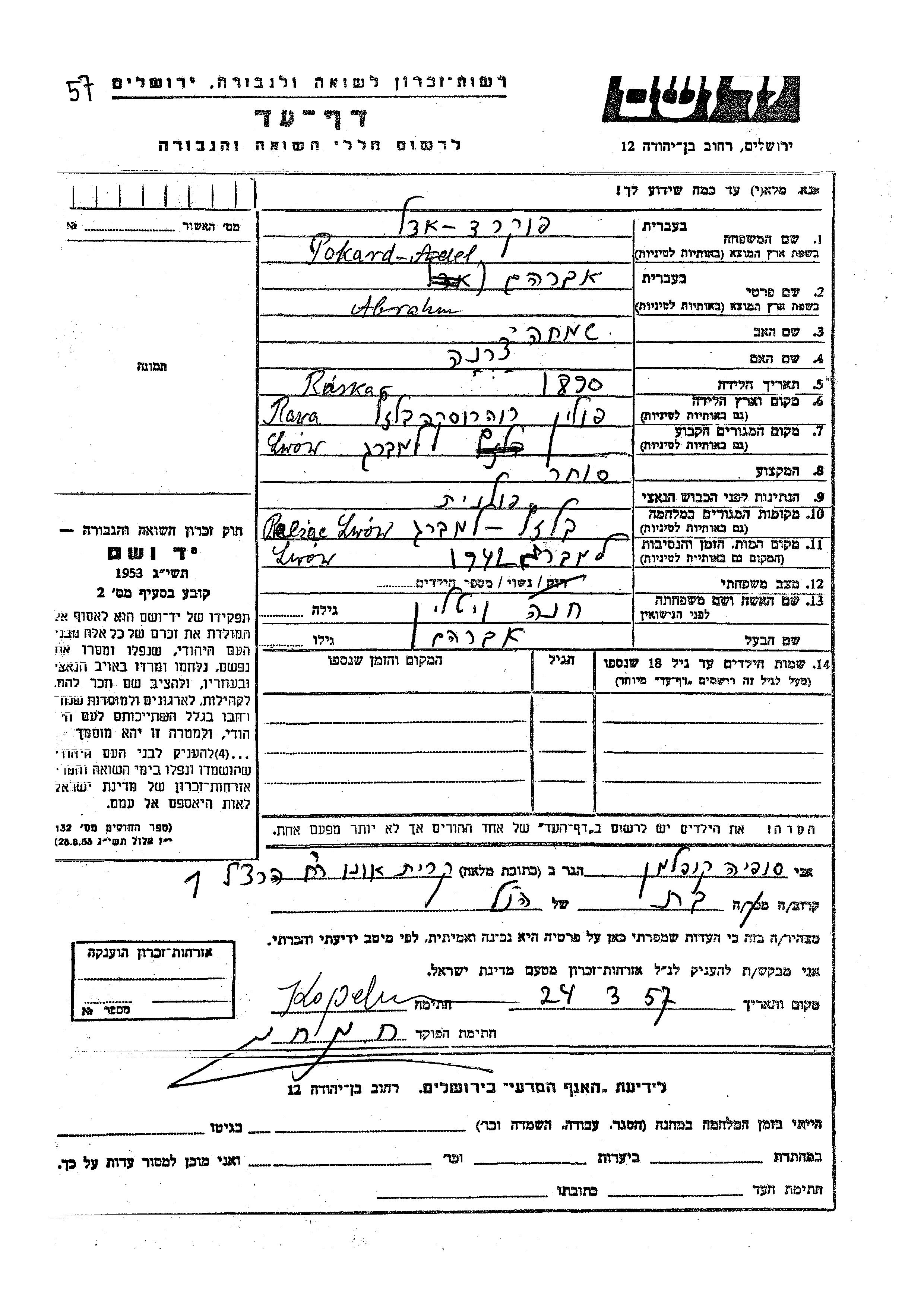 Абрахм Адель Покард, место рождения: Рава-Русская, Польша. Отец: Симха, mать:Чарна. Торговец / торговка. Женат / замужем. Место жительства до войны: Львов, Польша. Место во время войны: Львов, Польша.