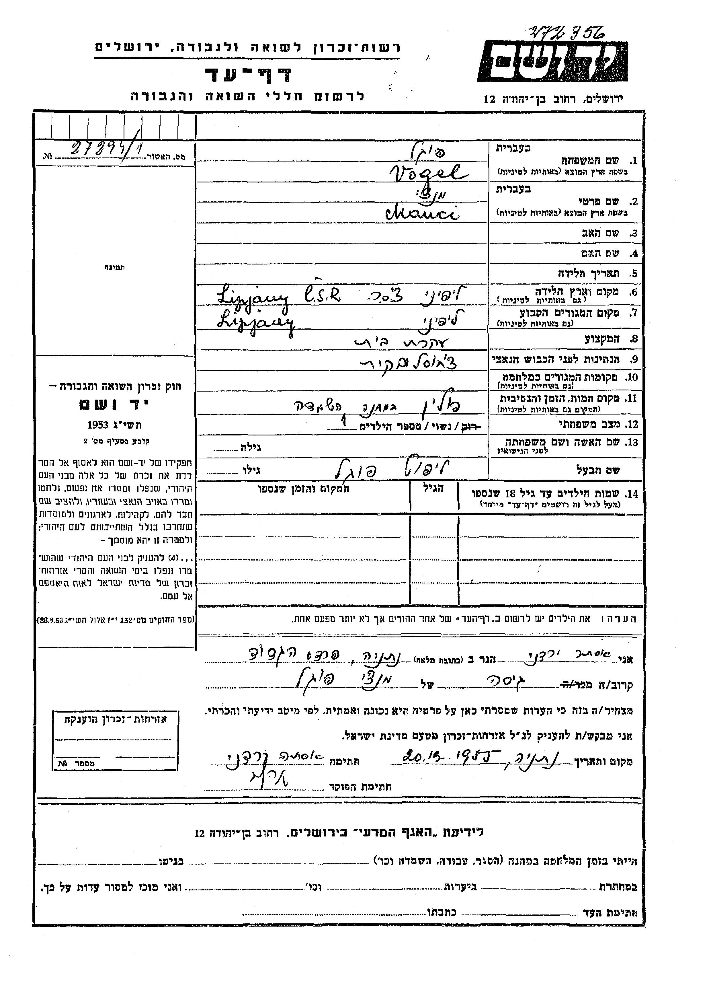Манци Фогель, место рождения: Липьяны, Чехословакия. Домохозяйка. Женат / замужем. Место жительства до войны: Липьяны, Чехословакия.