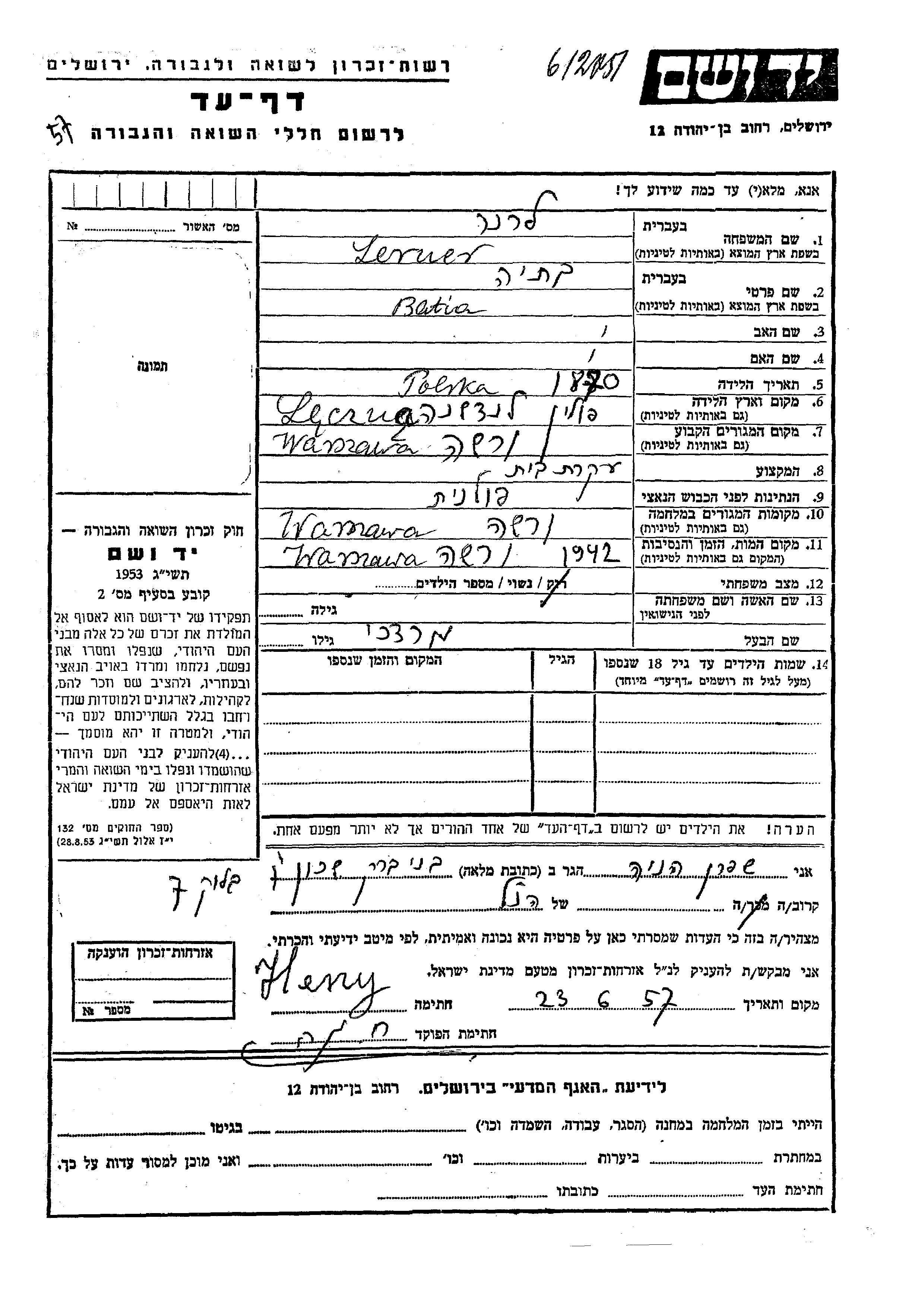 Батья Лернер, место рождения: Ленчна, Польша. Домохозяйка. Женат / замужем. Место жительства до войны: Варшава, Польша. Место во время войны: Варшава, Польша.