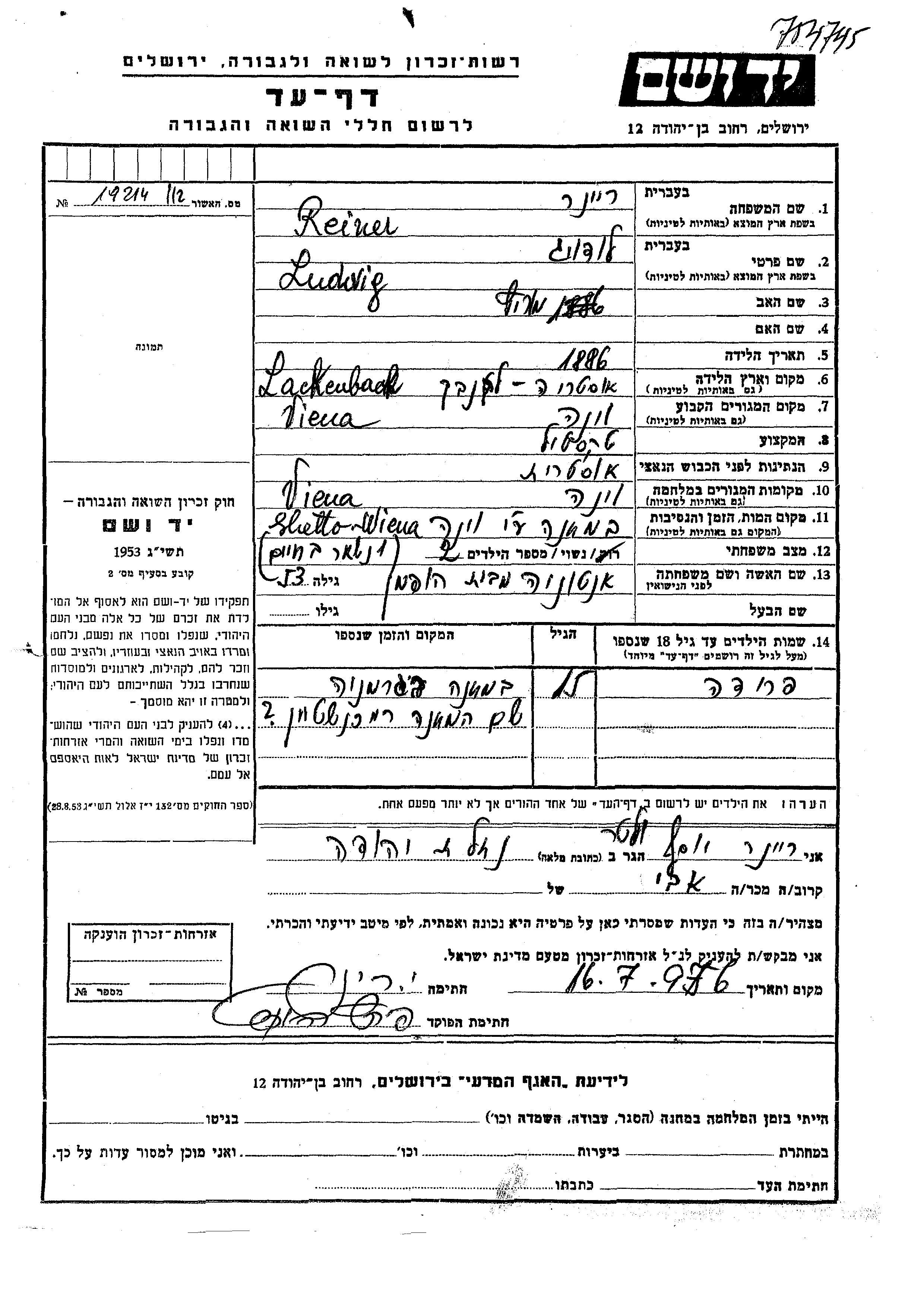 Лудвиг Рейнер, место рождения: Лакенбах, Австрия. Отец: Мориц. Женат / замужем. Место жительства до войны: Вена, Австрия. Место во время войны: Вена, Австрия.