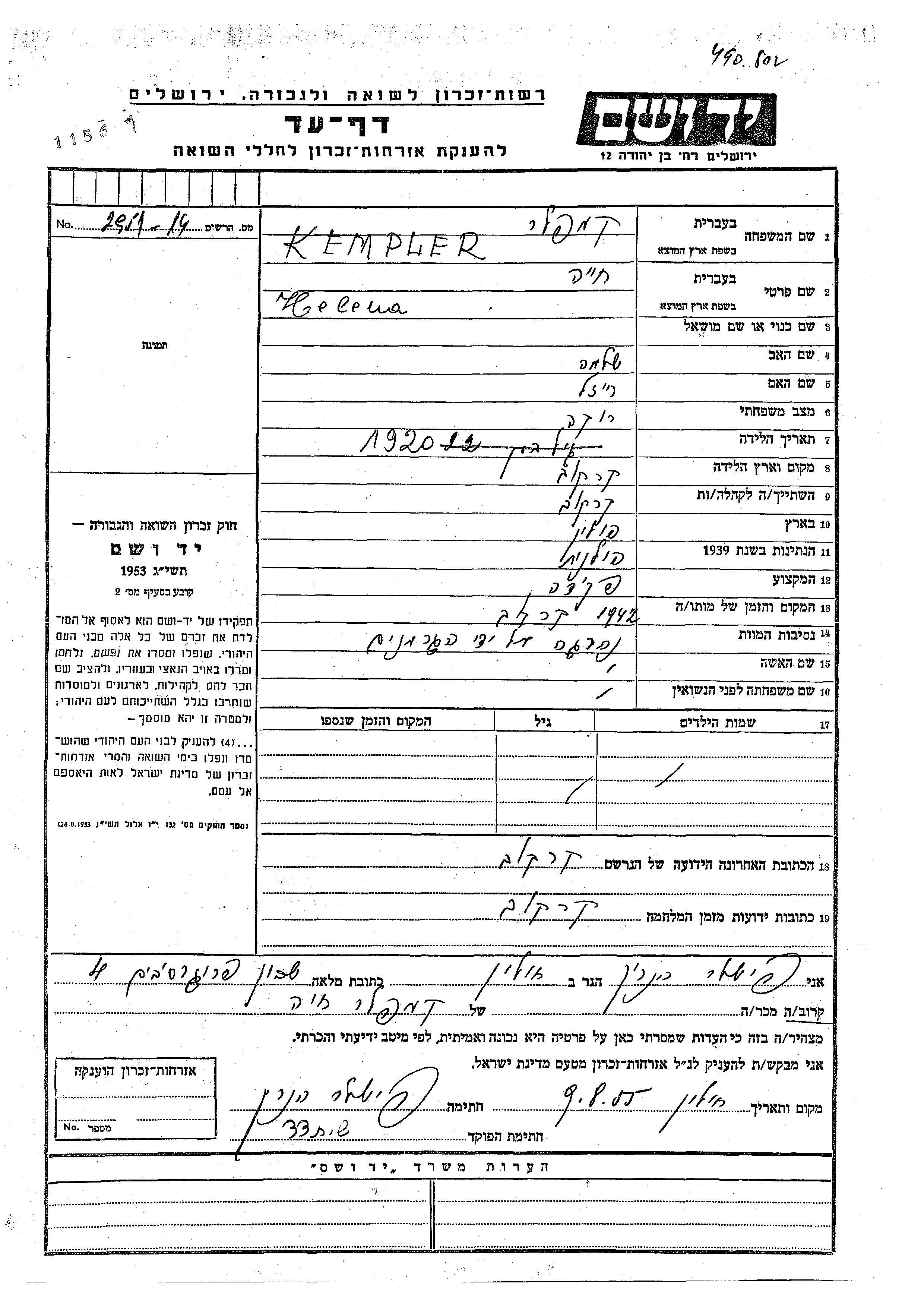 Хая Хелена Кемплер, место рождения: Краков, Польша. Отец: Шломо, mать:Рейзл. Клерк. Холост / не замужем. Место жительства до войны: Краков, Польша. Место во время войны: Краков, Польша.