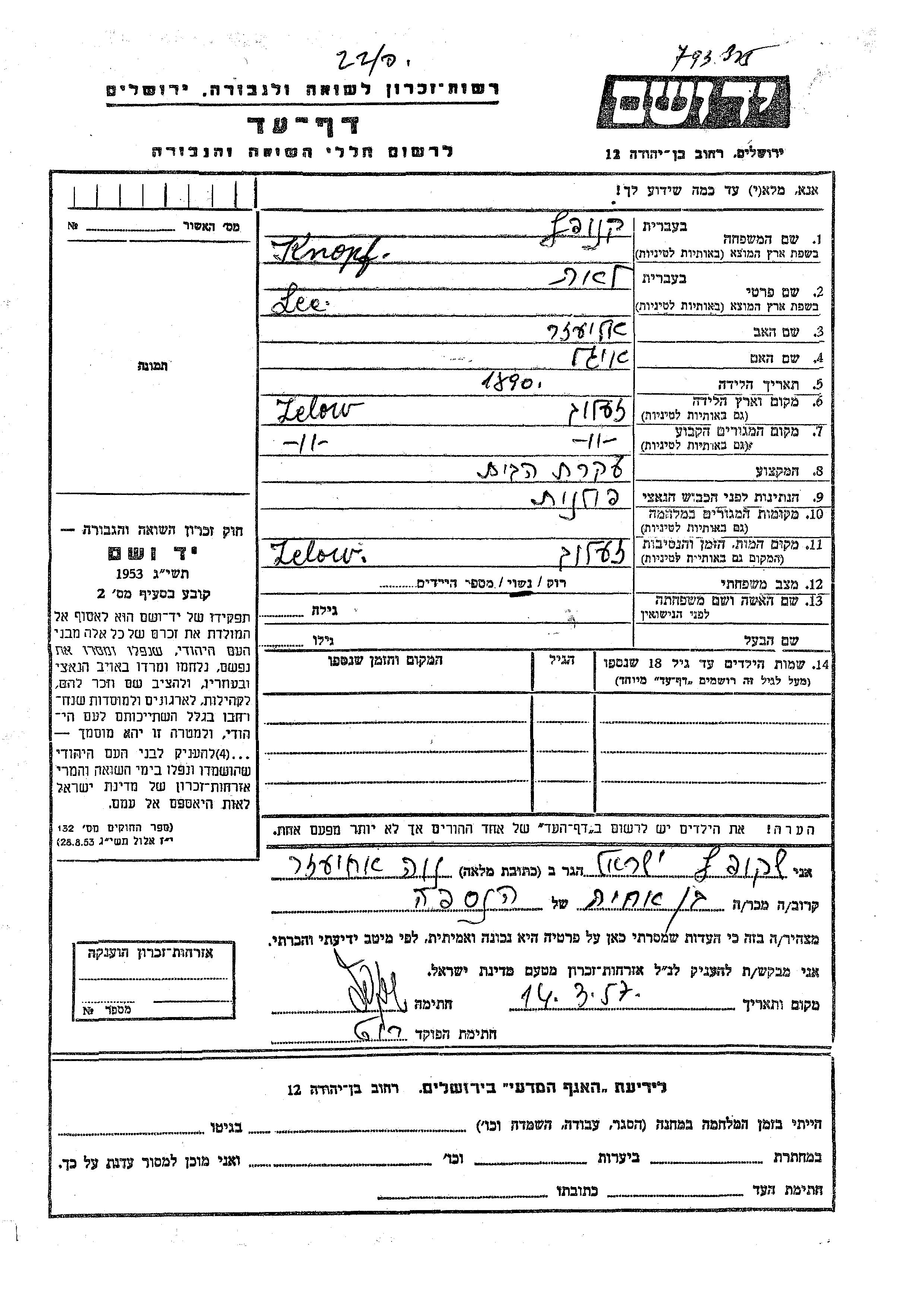 Лея Кнопф, место рождения: Зелув, Польша. Отец: Элиэзер, mать:Игаль. Домохозяйка. Женат / замужем. Место жительства до войны: Зелув, Польша.